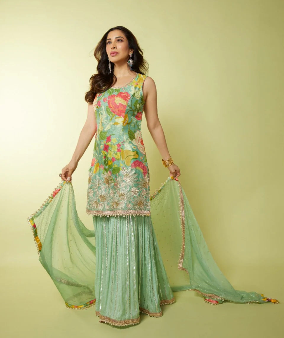 Elevate your ethnic wardrobe with our stunning sharara set, featuring a floral printed kurta with exquisite embroidery along the hem. The embellished striped sharara adds a modern twist, while the matching dupatta completes this graceful ensemble. Perfect for festive occasions, this outfit beautifully blends tradition with contemporary style!