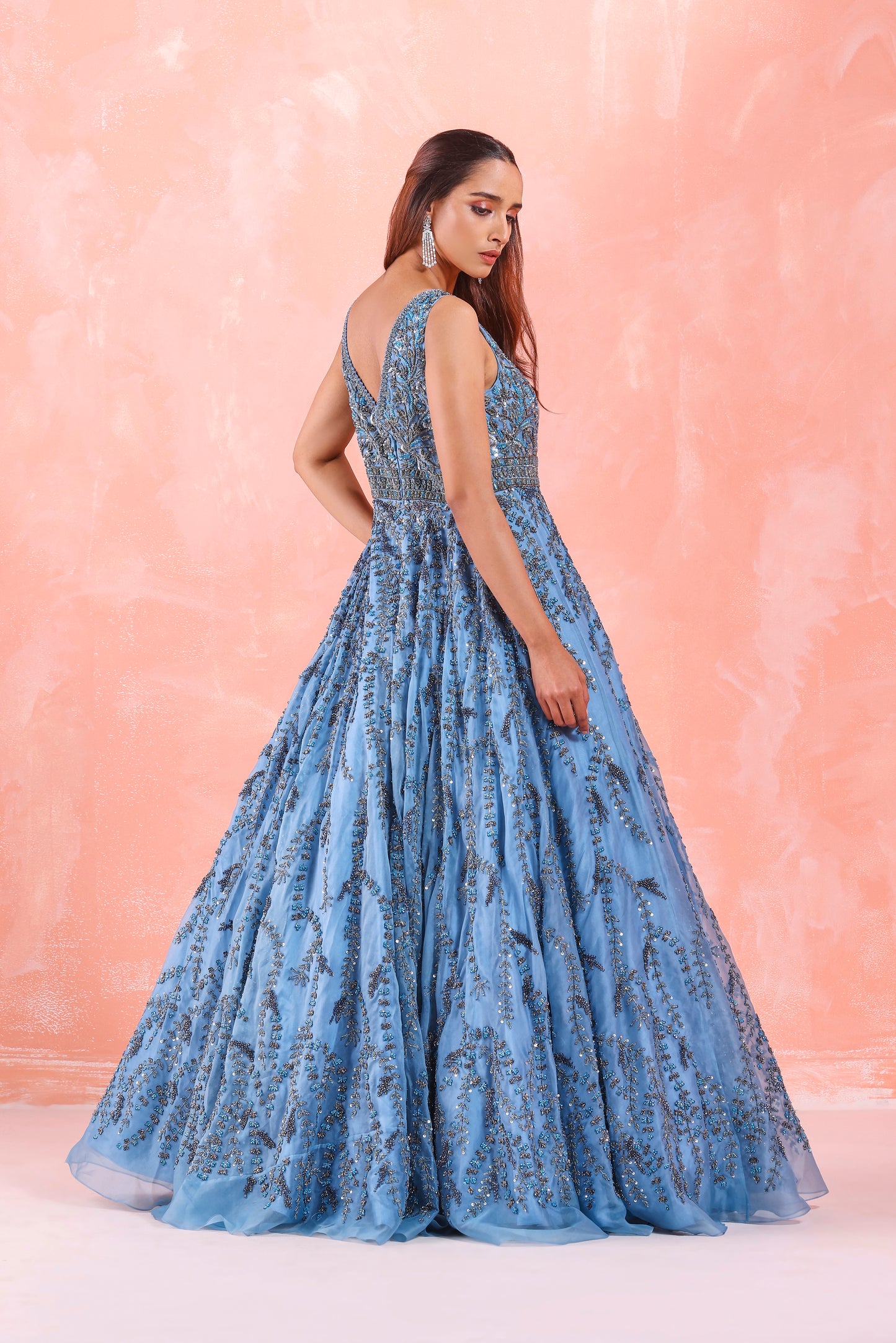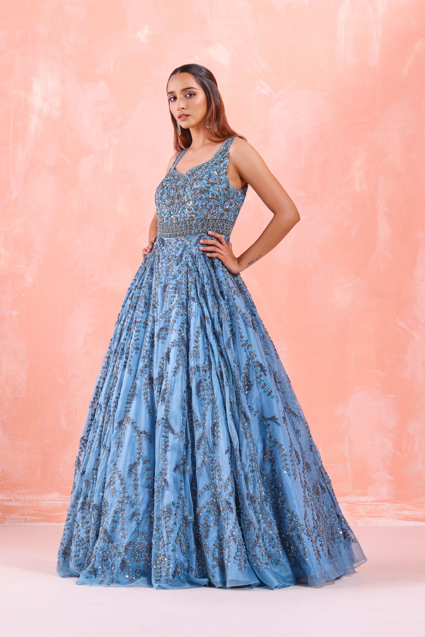 Steel Blue Sleeveless Gown Based On Organza Features Intricate Weaving Of Tonal Sequins And Beads Embroidery Detailing.