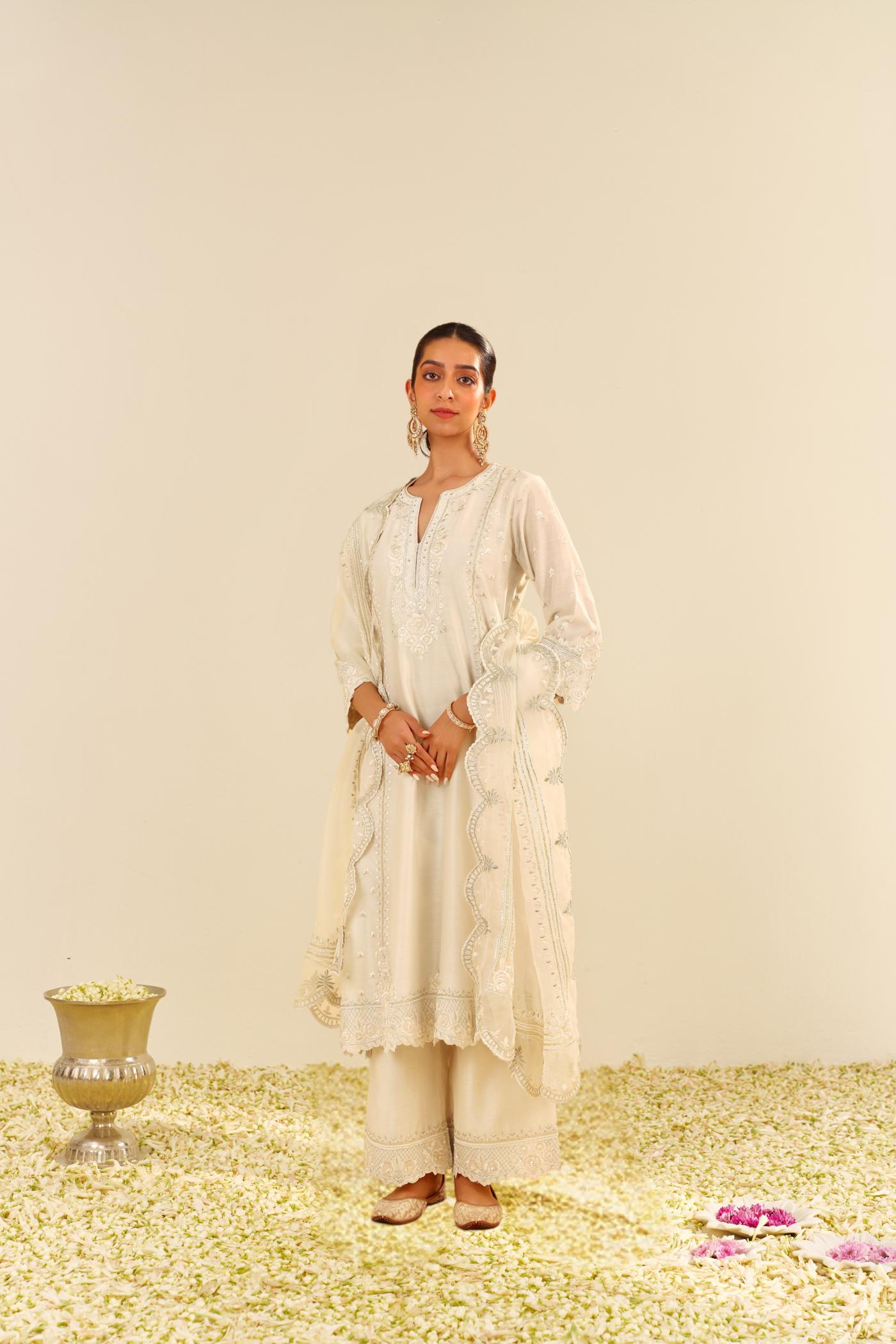Adorned With Intricate Parsi Gara Embroidery, The Ensemble Is Highlighted With Fine Tilla, Gota, And Basra Moti Embellishments, Adding Richness And Depth To The Design. The Sleeves Of The Kurta Are Finished With Detailed Pearls, Providing A Refined And Sophisticated Touch. The Entire Outfit Is Completed With Scallop Detailing, Which Enhances The Overall Elegance. The Dupatta Is Also Finished With Scallop Embroidery, Perfectly Complementing The Ensemble And Adding An Extra Layer Of Finesse. This Stunning Creation Exudes Grace, Opulence, And Attention To Detail.