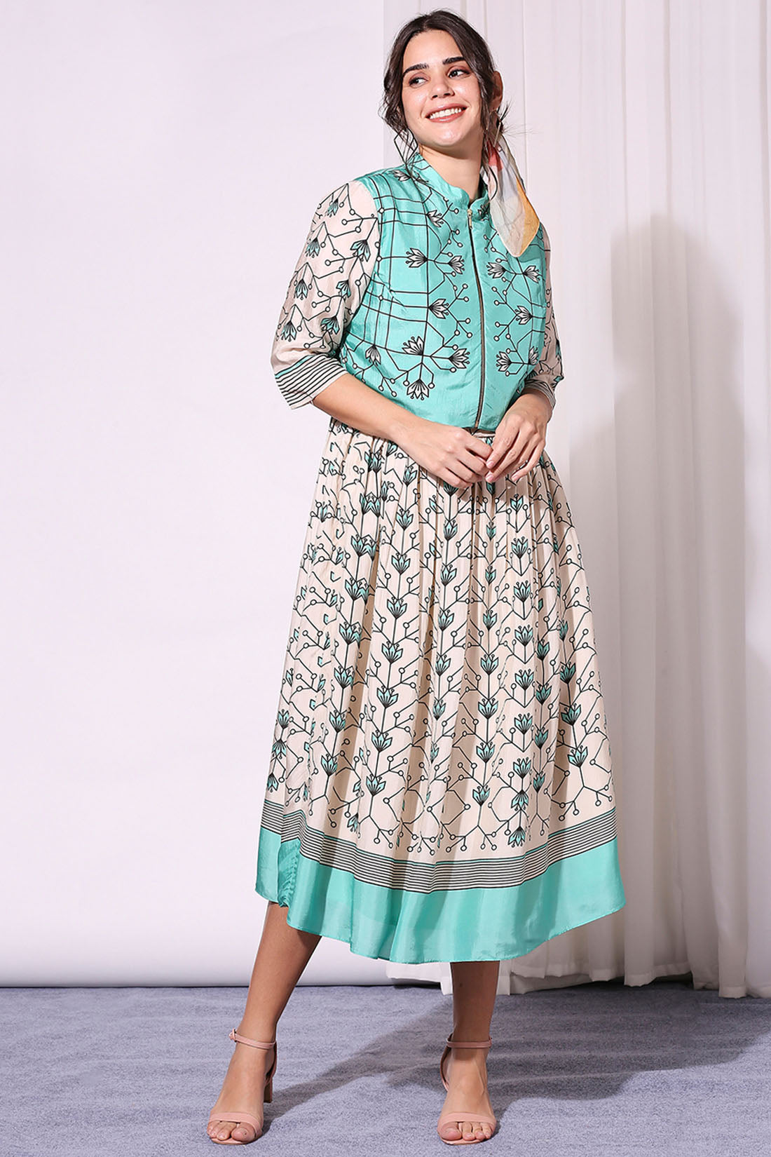Off White Gathered Dress Based On Tussar Silk Features Summer Floral Print. It Is Paired With Sea Green Sleeveless Printed Jacket.