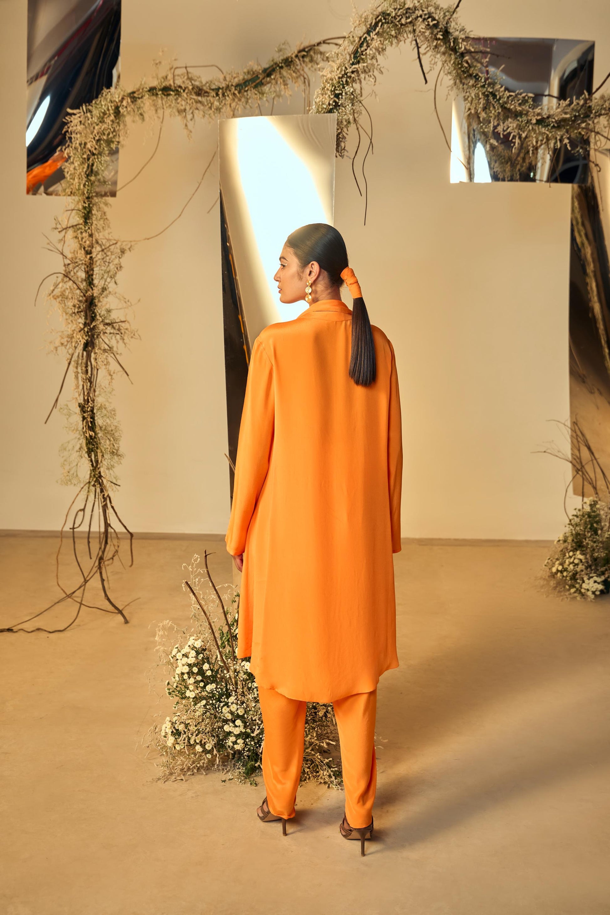 Asymmetrical Kurta With Flowy Cowl Wrap Around Neck With Floral Organza Applique. Comes With Smart Tulip Pants.