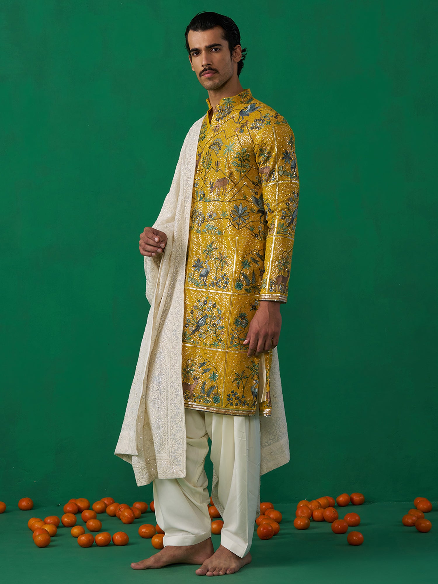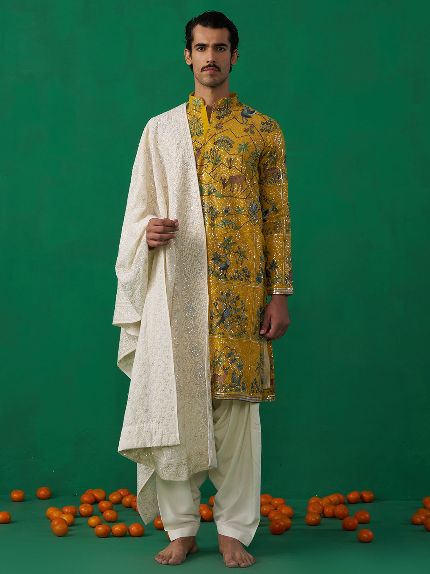 This Kurta Set Features A Long, Straight-Cut Kurta With Intricate All-Over Embroidery And Floral And Swan-Inspired Motifs, Paired With Patiyala-Style Bottoms That Add Volume And Comfort To The Silhouette. It Is Styled With A Contrasting Heavy Dupatta, Richly Adorned With Elaborate Embroidered Borders And Detailed Motifs, Bringing A Regal Touch To The Look. The Ensemble Combines Traditional Craftsmanship With A Statement-Making Presence, Perfect For Festive And Ceremonial Occasions.