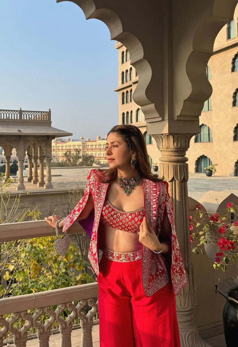 Presenting The Magnificent Pant Set With A Blazer—An Ensemble Seamlessly Blending Traditional Craftsmanship With Contemporary Design. This Exquisite Outfit Showcases Intricate Detailing And Threadwork, Resulting In A Mesmerizing Tapestry Of Captivating Patterns And Designs.