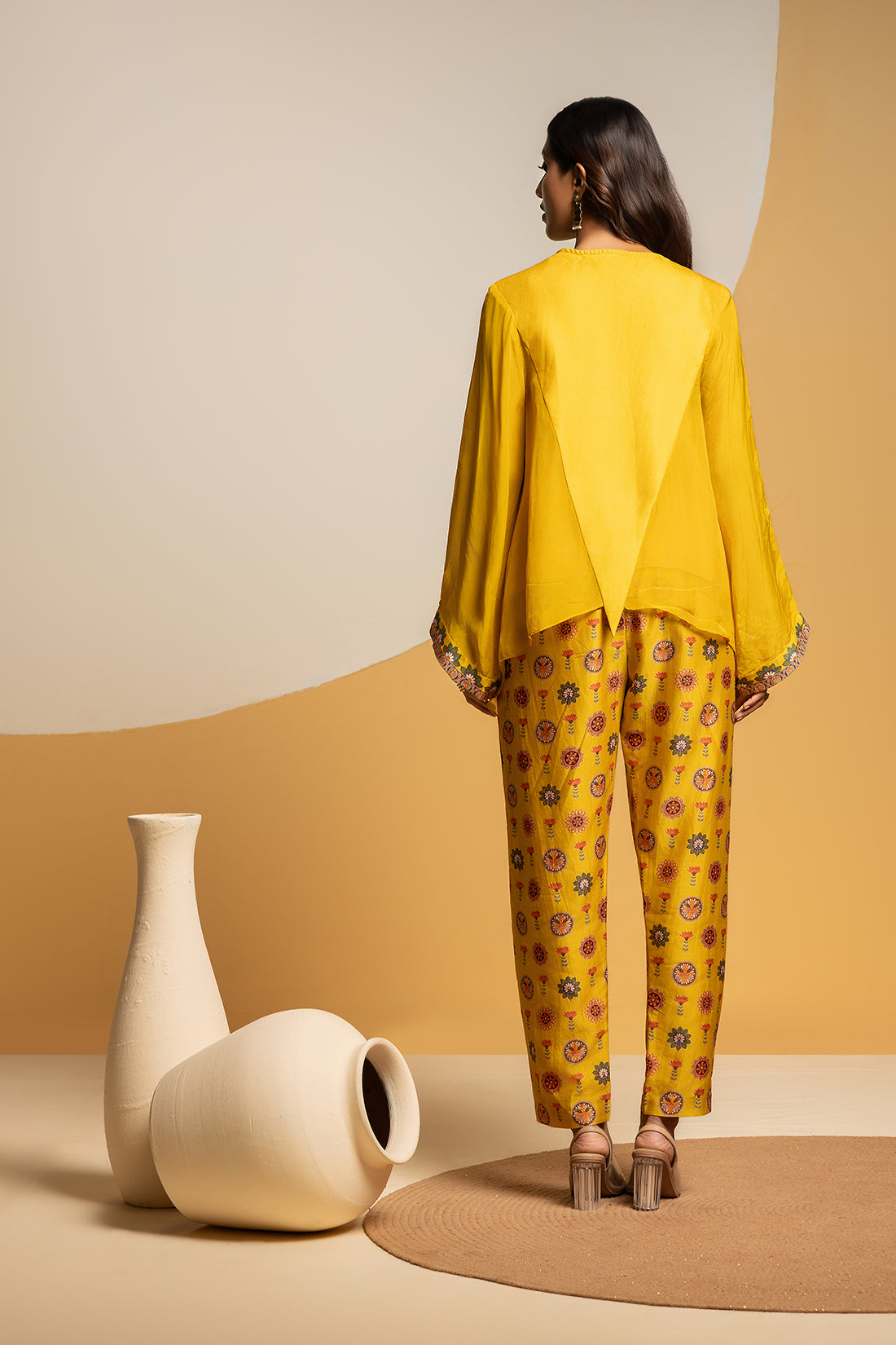 Yellow Taarani Embellished V-Neck Asymmetric Top, Paired With Printed Pants In Chanderi.