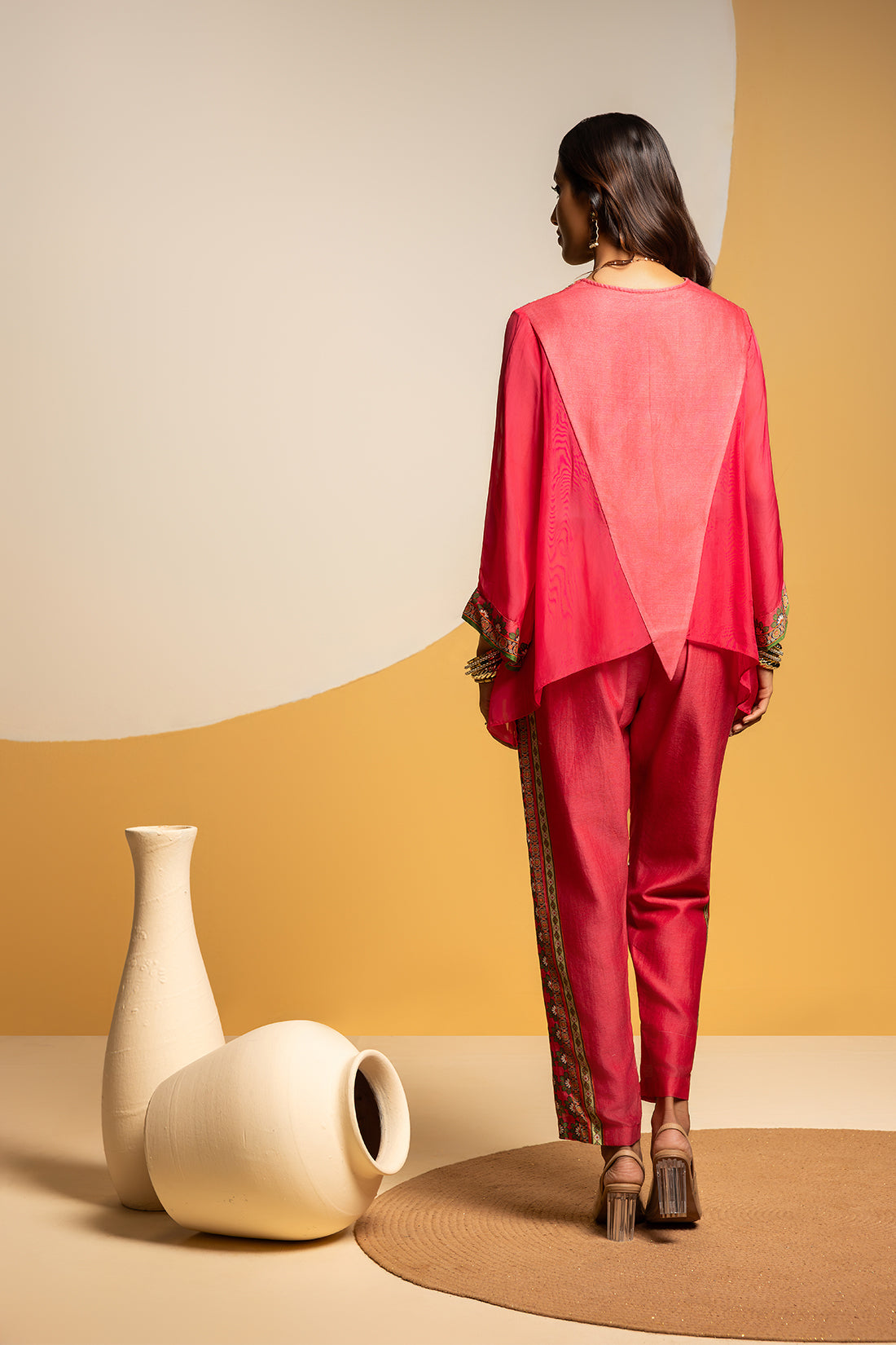 Pink Taarani Embellished V-Neck Asymmetric Top, Paired With Printed Pants In Chanderi.