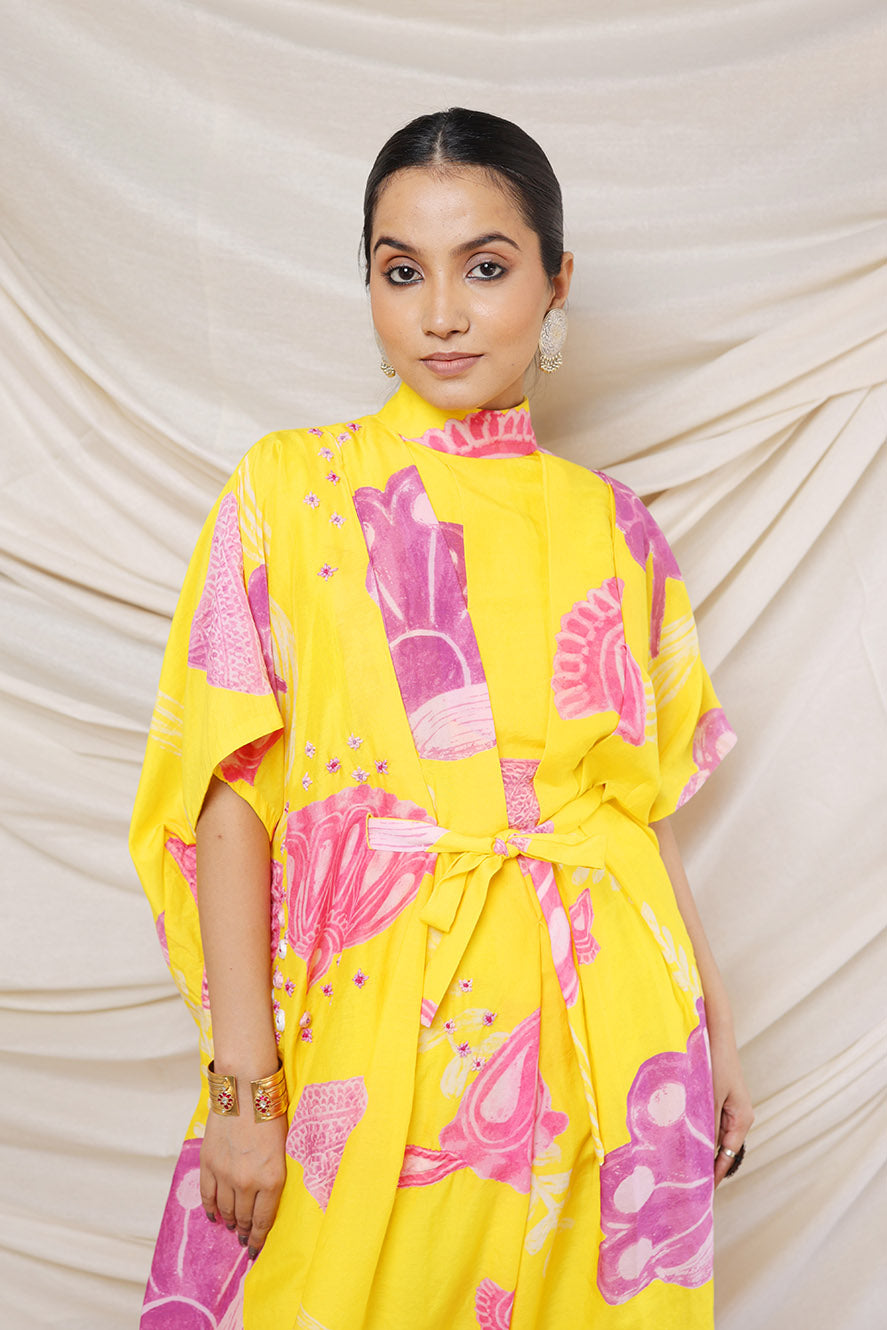 Pleated Draped Tunic With High Neck Collar And Front Tie Up Belt. It Is Paired With Printed Pants With Elasticated Waist. The Print Takes Its Inspiration From Crown Jewel Motifs From 'Mata Ni Pachedi' Painting. Natural Fabric Makes It Perfect For Summer Occasions.