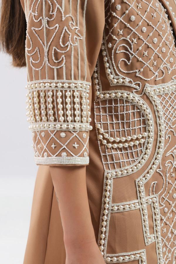 Its Featured Tan Colour Banana Crape Blazer Dress Embellished With Different Size Of Pearl Cutdana Work.