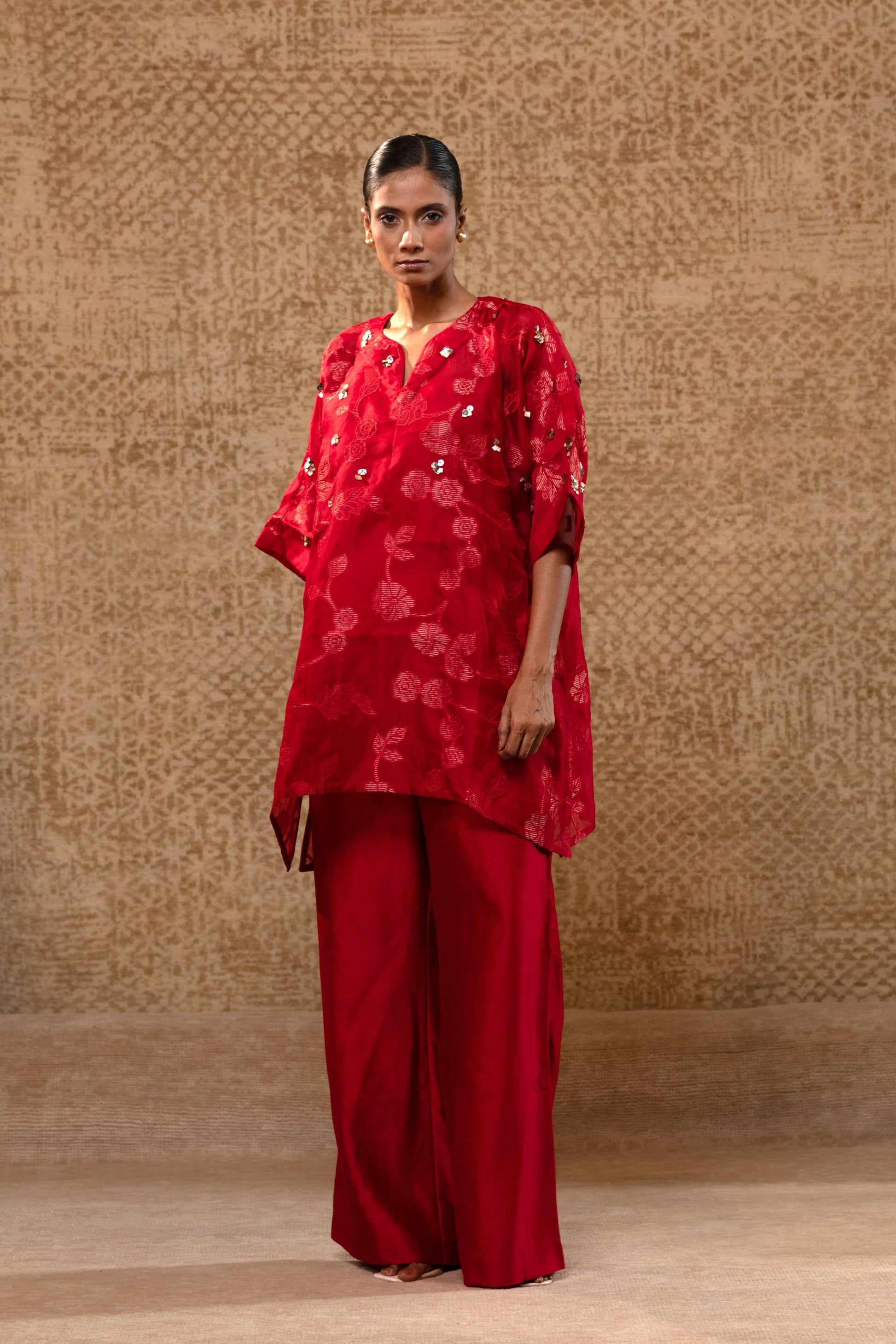A Relaxed-Fit Kurta Set In A Striking Bright Red, Featuring Pure Silk Organza Appliqued With Zari Chanderi Floral Patches. Embellished Delicately With Sequins, The Kurta Is Paired With Matching Wide-Leg Pants Effortless Yet Eye-Catching.