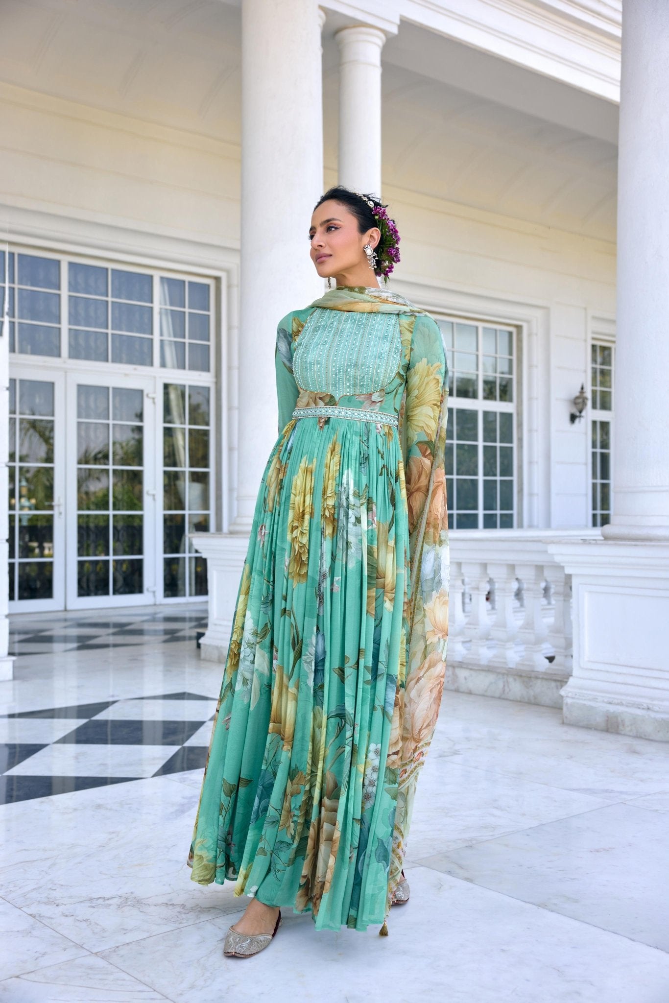 Featuring Tarini A Flowy Anarkali Set In Soft Floral Motifs And An Intricately Hand Embroidered Of Beads And Sequins On The Yoke Paired With Waist Band And Printed Dupatta. Perfect For Any Festive Or Wedding To Make A Style Statement.