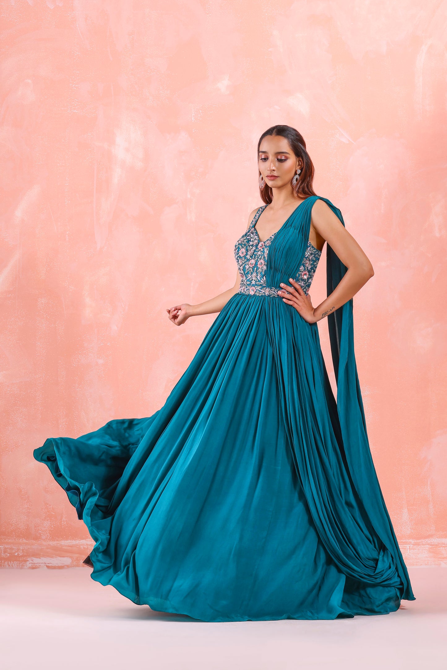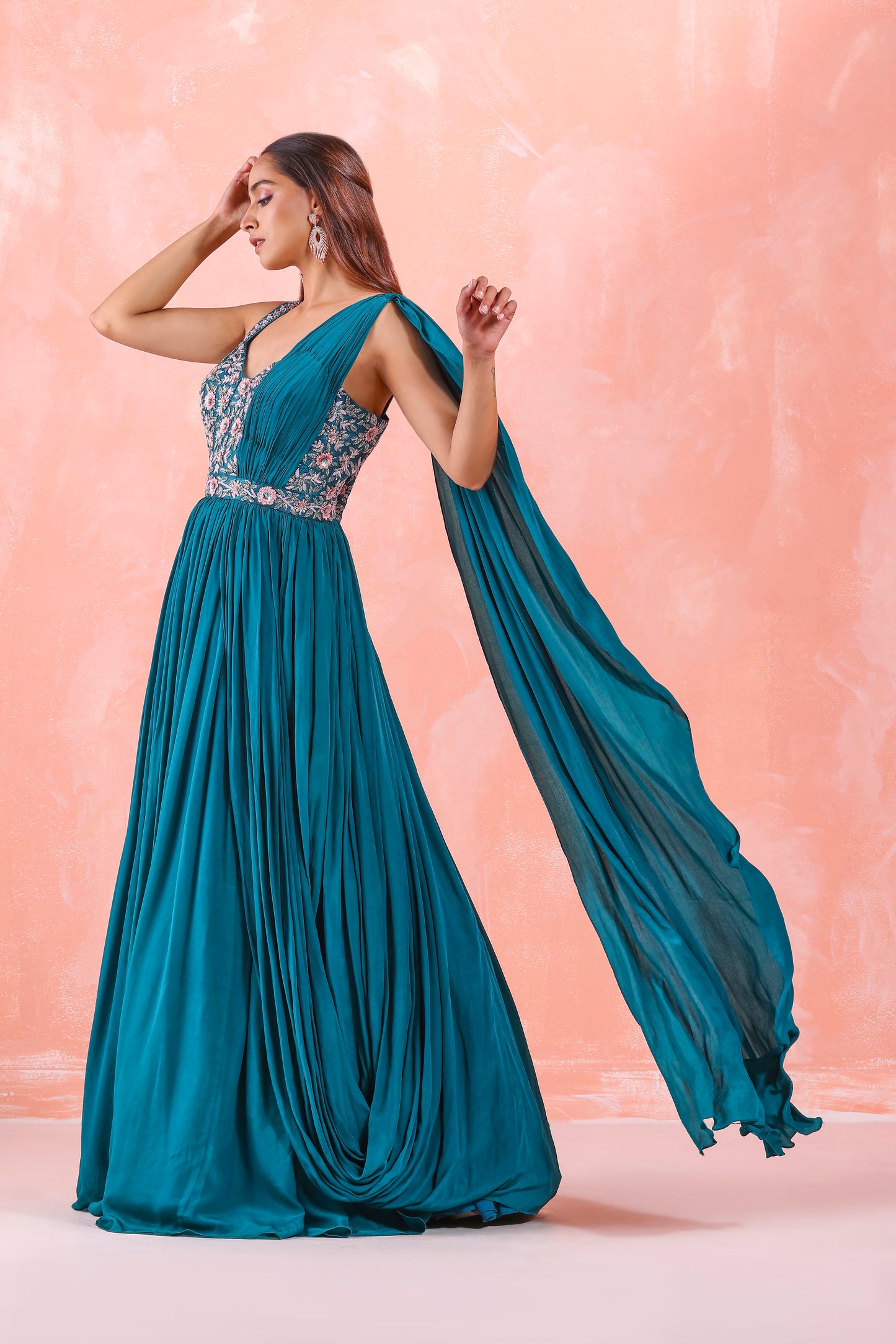Teal Green Gown Featuring A Drape Adorns The Bodice In Tonal Sequins And Beads Embroidery Woven On Silk Organza, Net And Viscose Georgette.