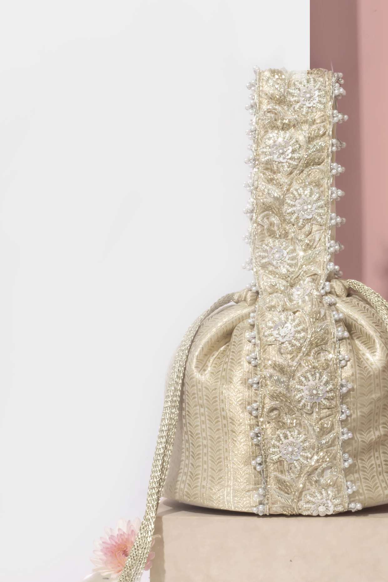 Material: Banaras Fabric, Poly Satin Lining, Woven Silver Drawstring, Hand Embroidered Handle And Zari Thread Tassels