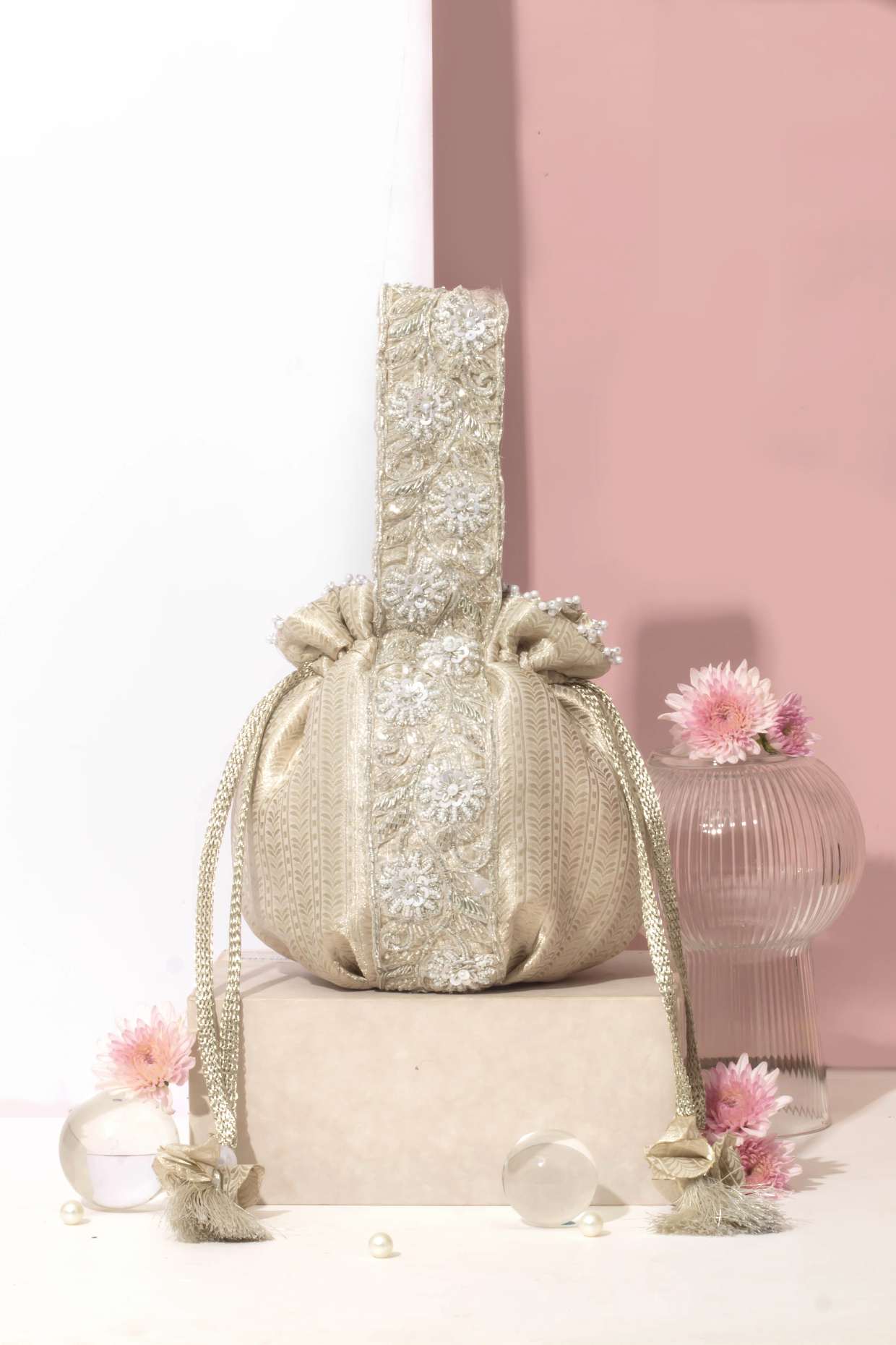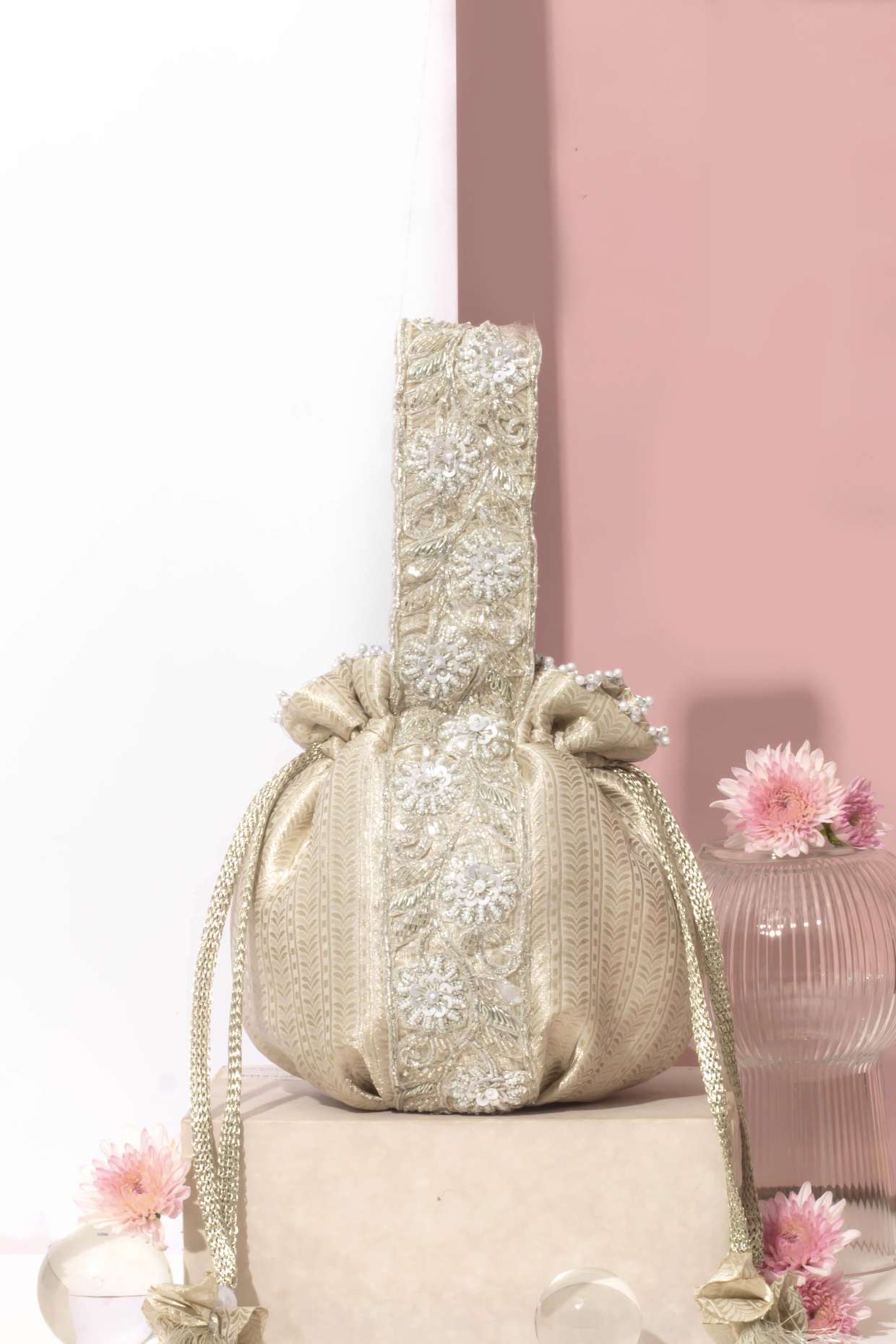 Our Tej Silver Potli Is A Beautifully Round-Shaped Potli That Enhances Your Look Effortlessly, Making It A Standout Accessory. Made From Premium Banaras Fabric, Showcasing Traditional Craftsmanship With A Contemporary Flair. Gleaming Silver, Perfect For Complementing Any Attire. The Embroidered Center Lace Doubles As A Handle, Offering Both Style And Functionality. Its Intricate Detailing Adds An Extra Layer Of Elegance. Perfect For Weddings, Festive Occasions, Or As A Statement Piece For Any Celebration!