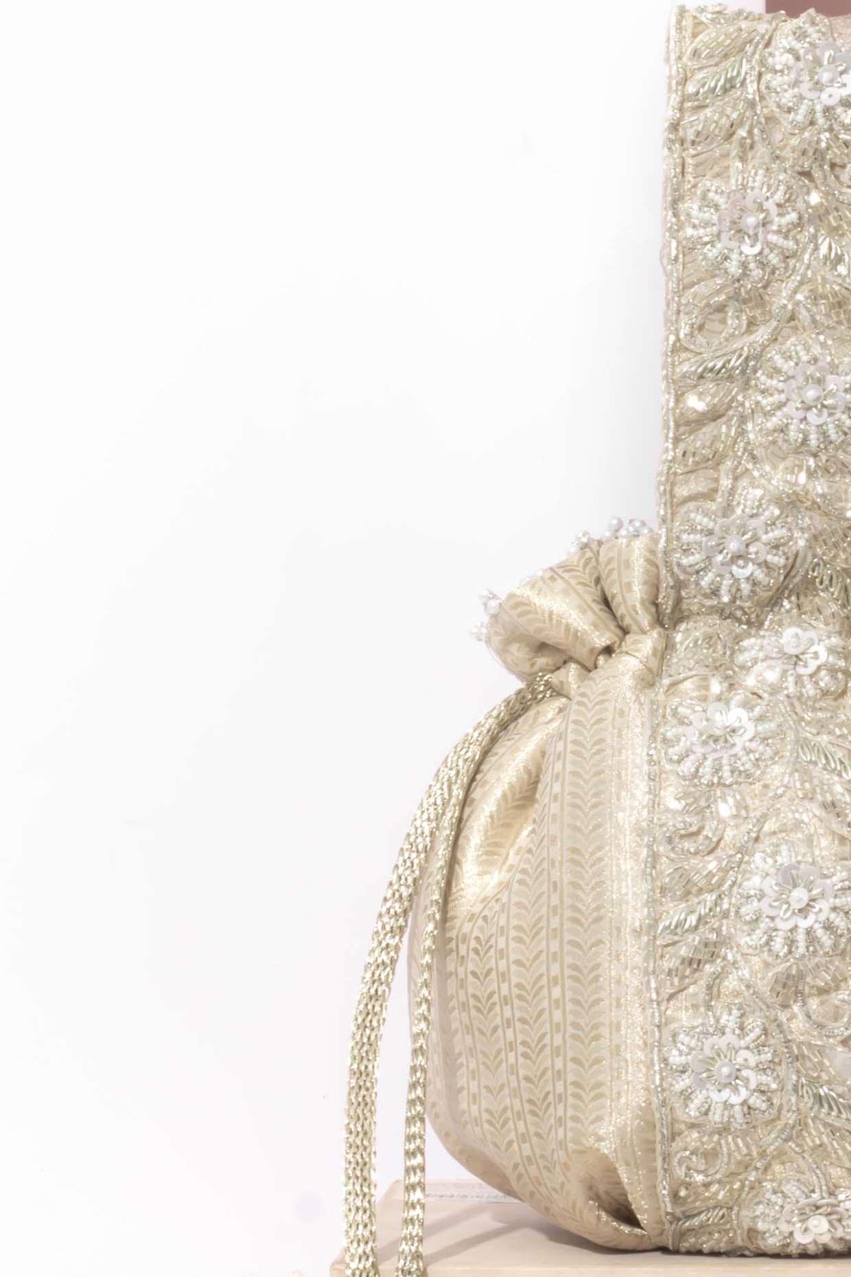 Material: Banaras Fabric, Poly Satin Lining, Woven Silver Drawstring, Hand Embroidered Handle And Zari Thread Tassels
