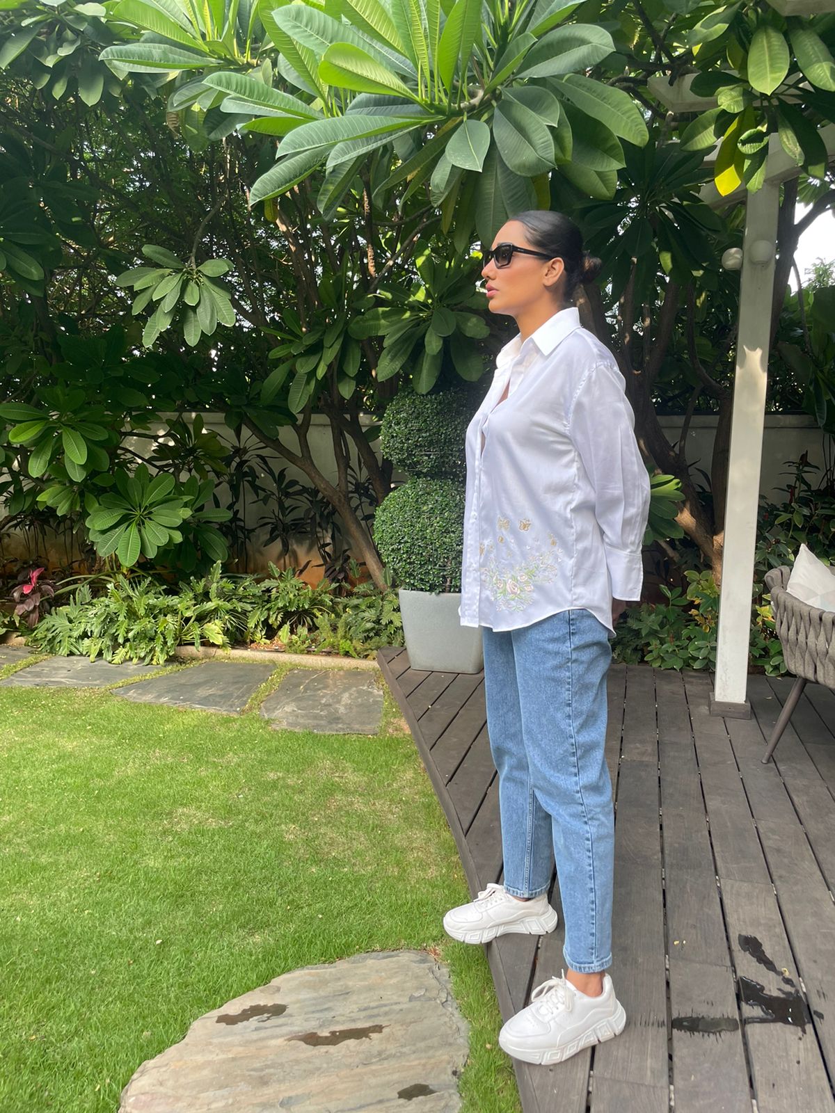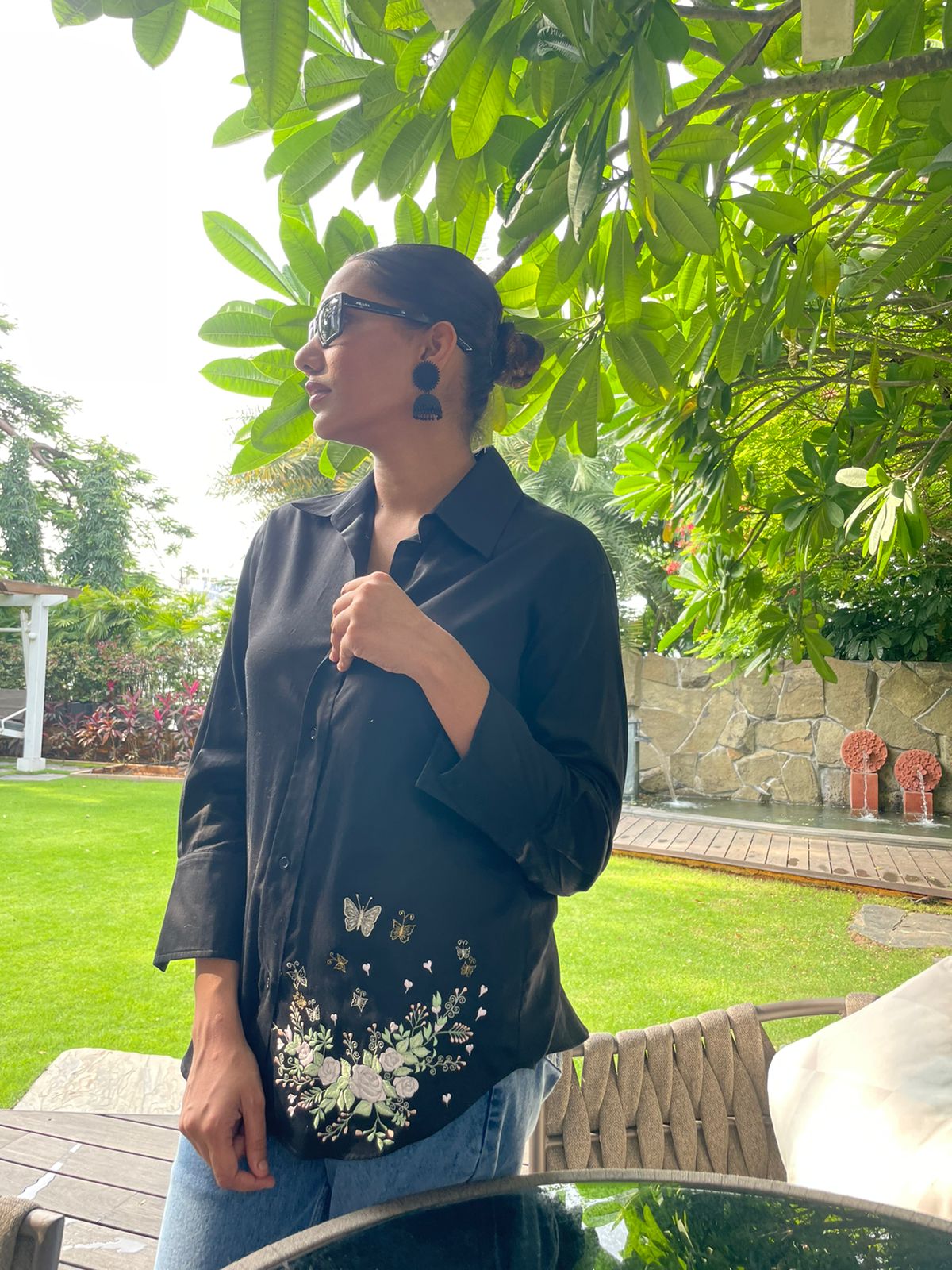 The Oversized Drop Shoulder Titli Shirt Based On Cotton Satin Features Intricate Resham And Zari Embroidery On The Bottom Left Side.