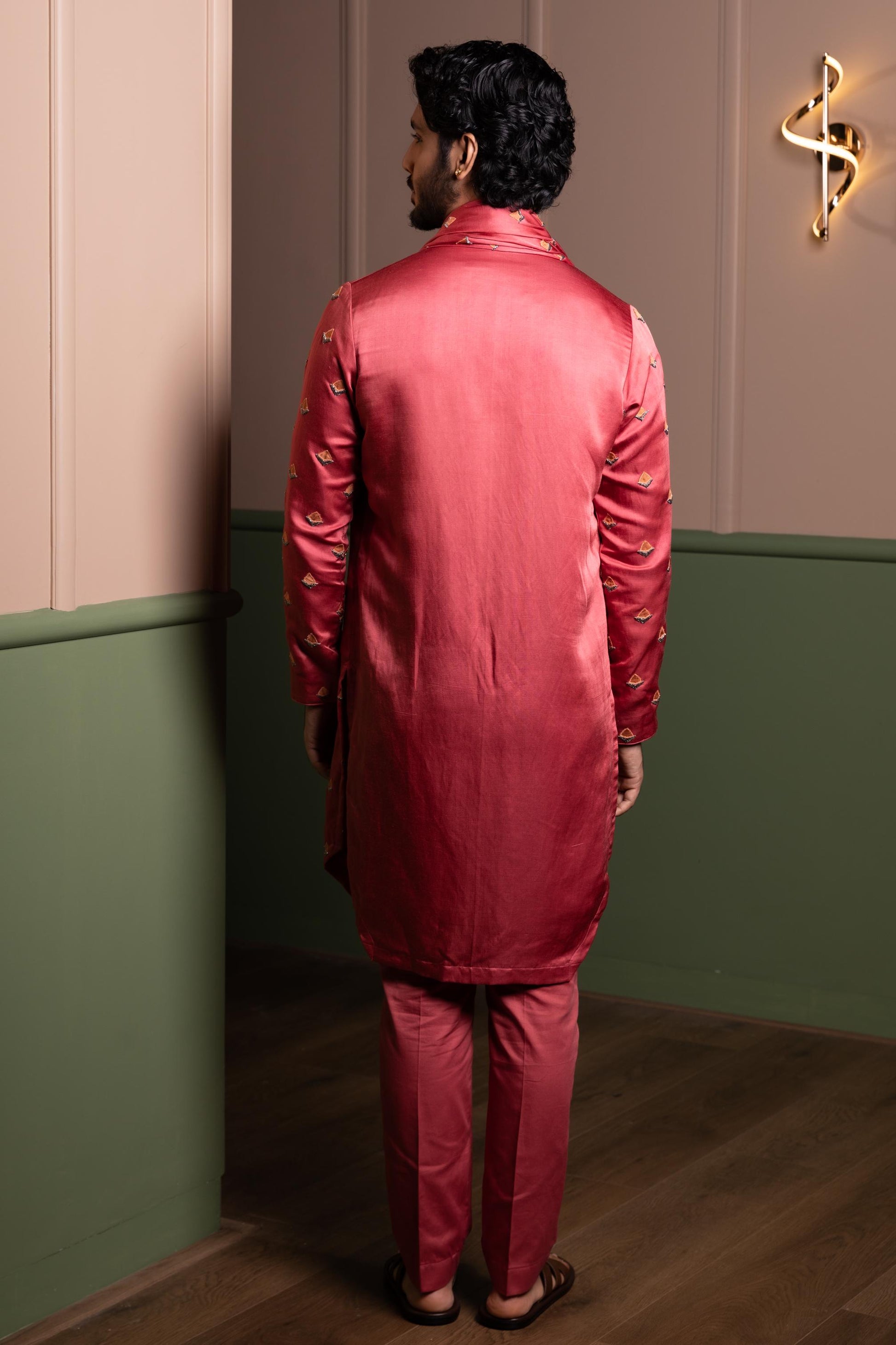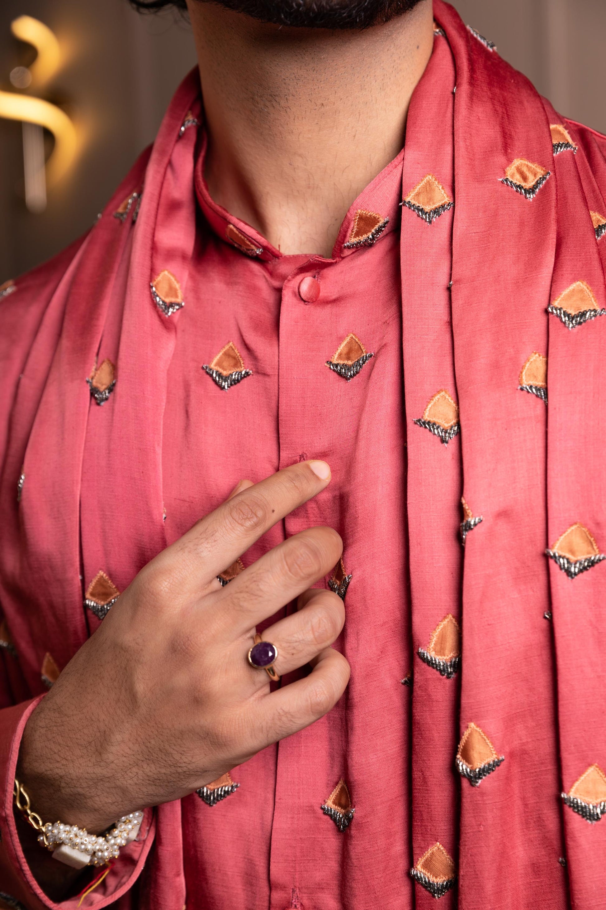 Satin Linen Kurta Stole With Patchwork Embroidery Paired With Monotone Pants.