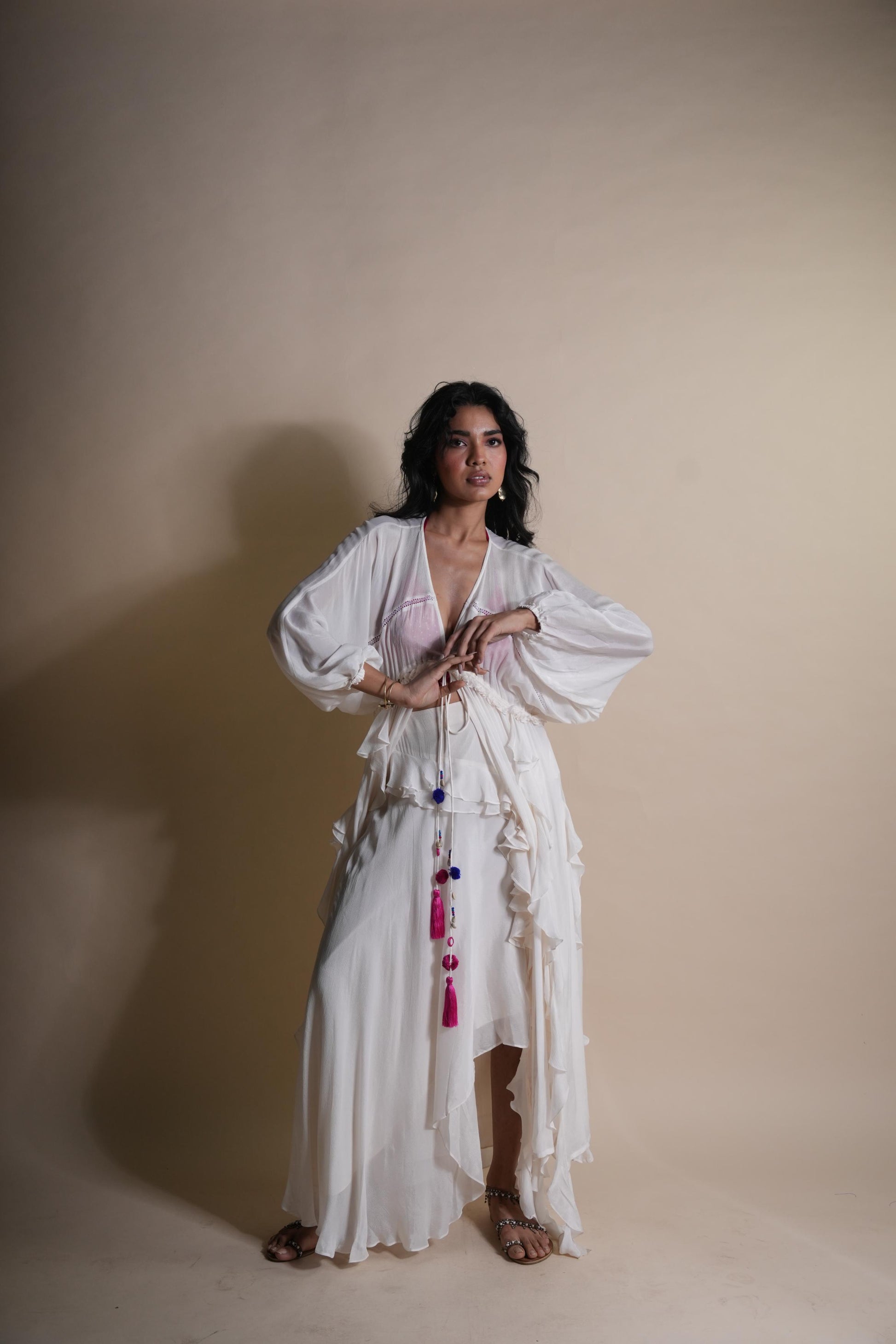 Breezy, Elegant, And Made To Flow. This Ivory Cascade Ruffle Skirt In Chinon Chiffon Brings Soft Drama With Its High Slits And Layered Ruffles. Style It With The Matching Ivory Ruffle Duster For A Dreamy Set, Or Pair It With A Basic Ganji For An Easy, Elevated Summer Look. Straight Off The Runway, Right Into Your Closet.