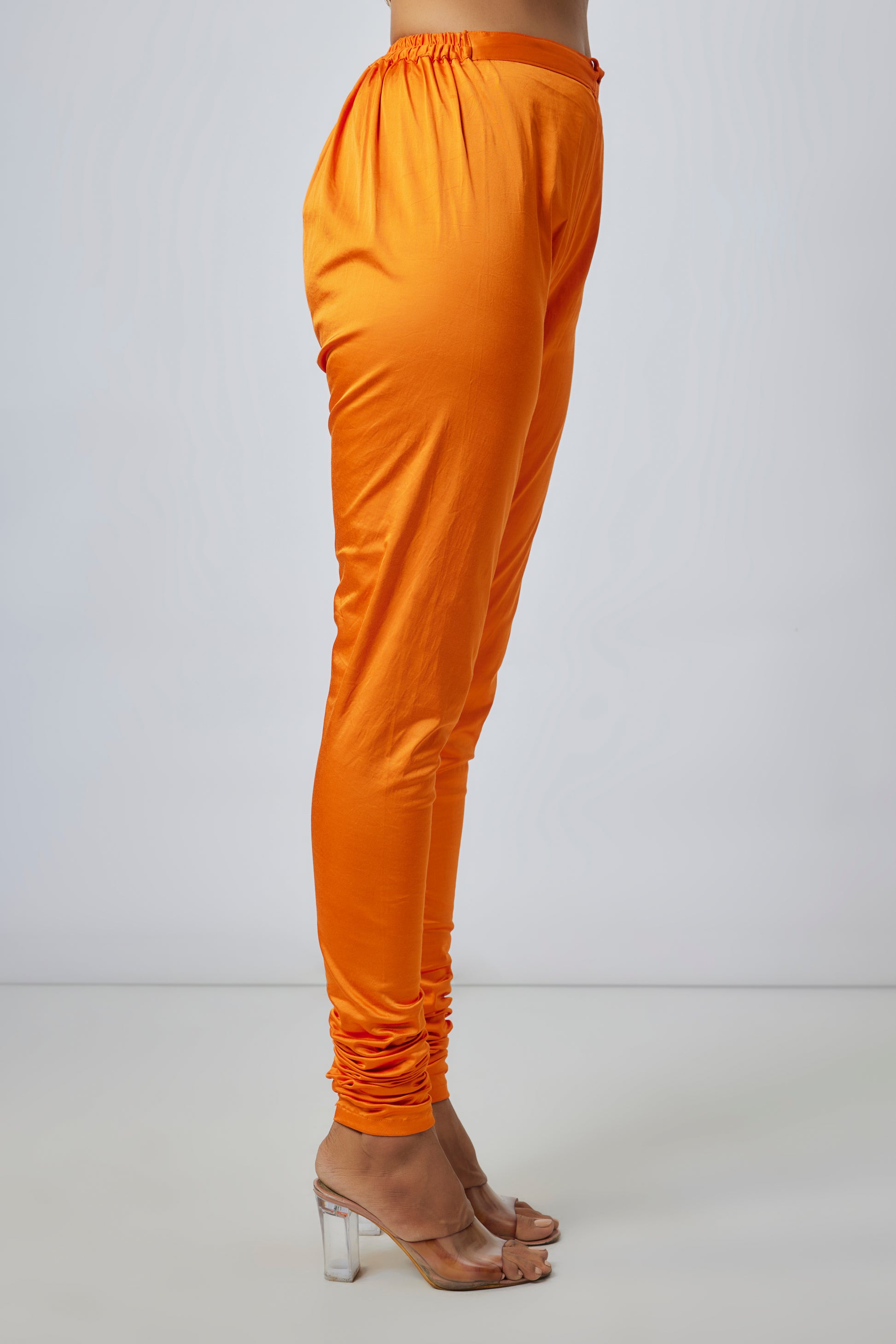 Featuring Classic Orange Anarkali. Intricate Mirror Work And Embroidery Adorn The Neckline, Cuffs, And The Hemline. Paired With Churidar And Net Dupatta With Scattered Mirror Motifs Completing The Look.