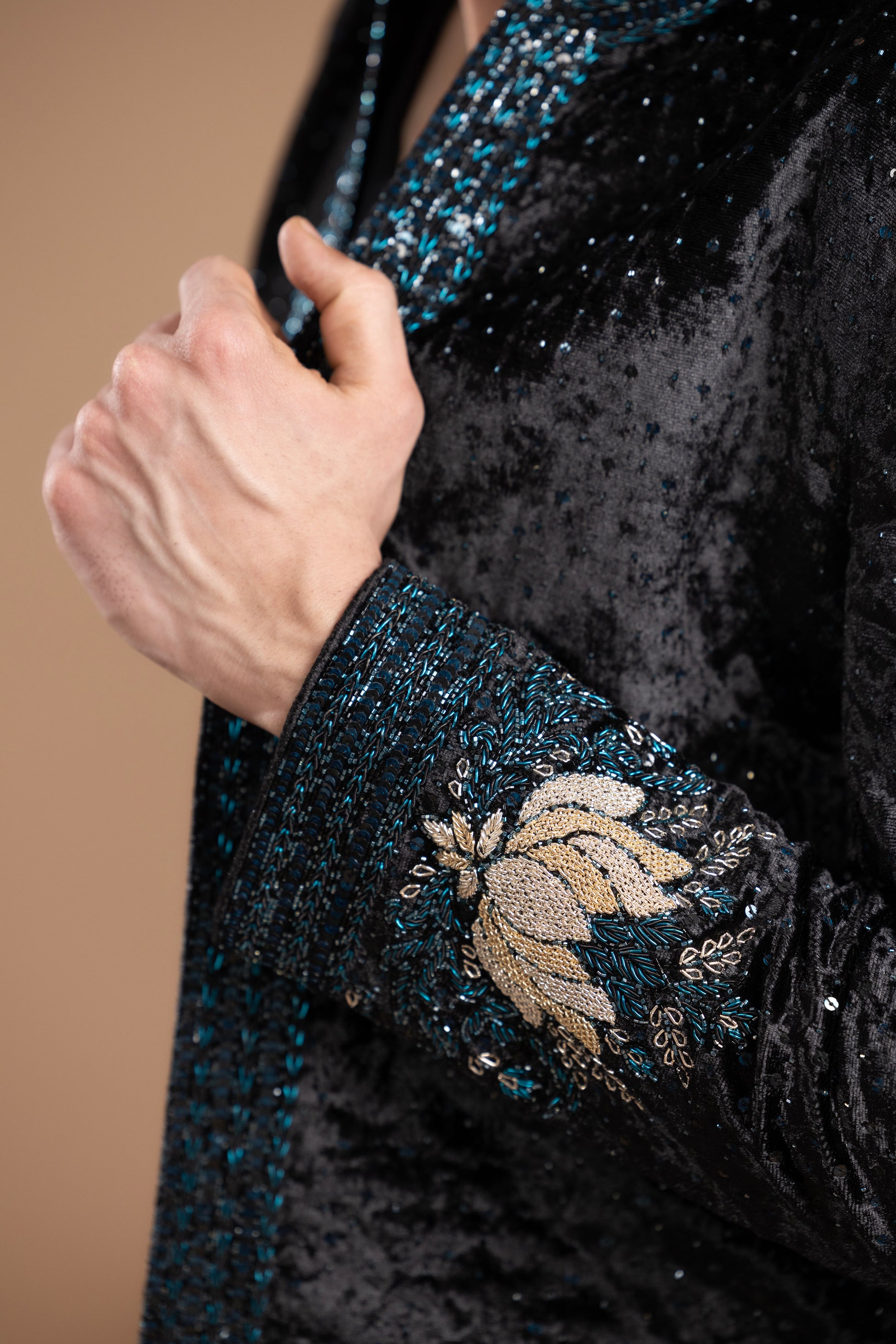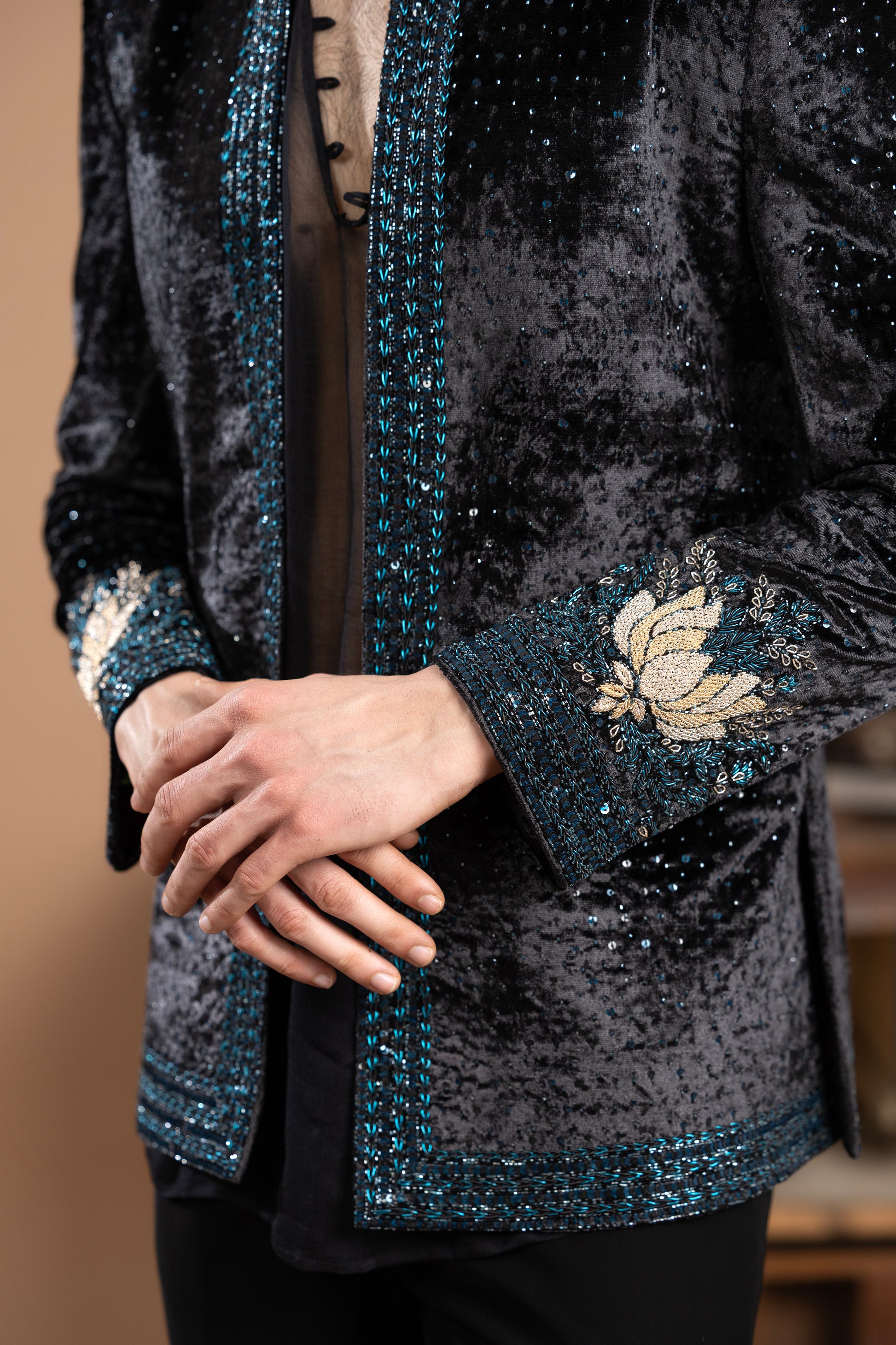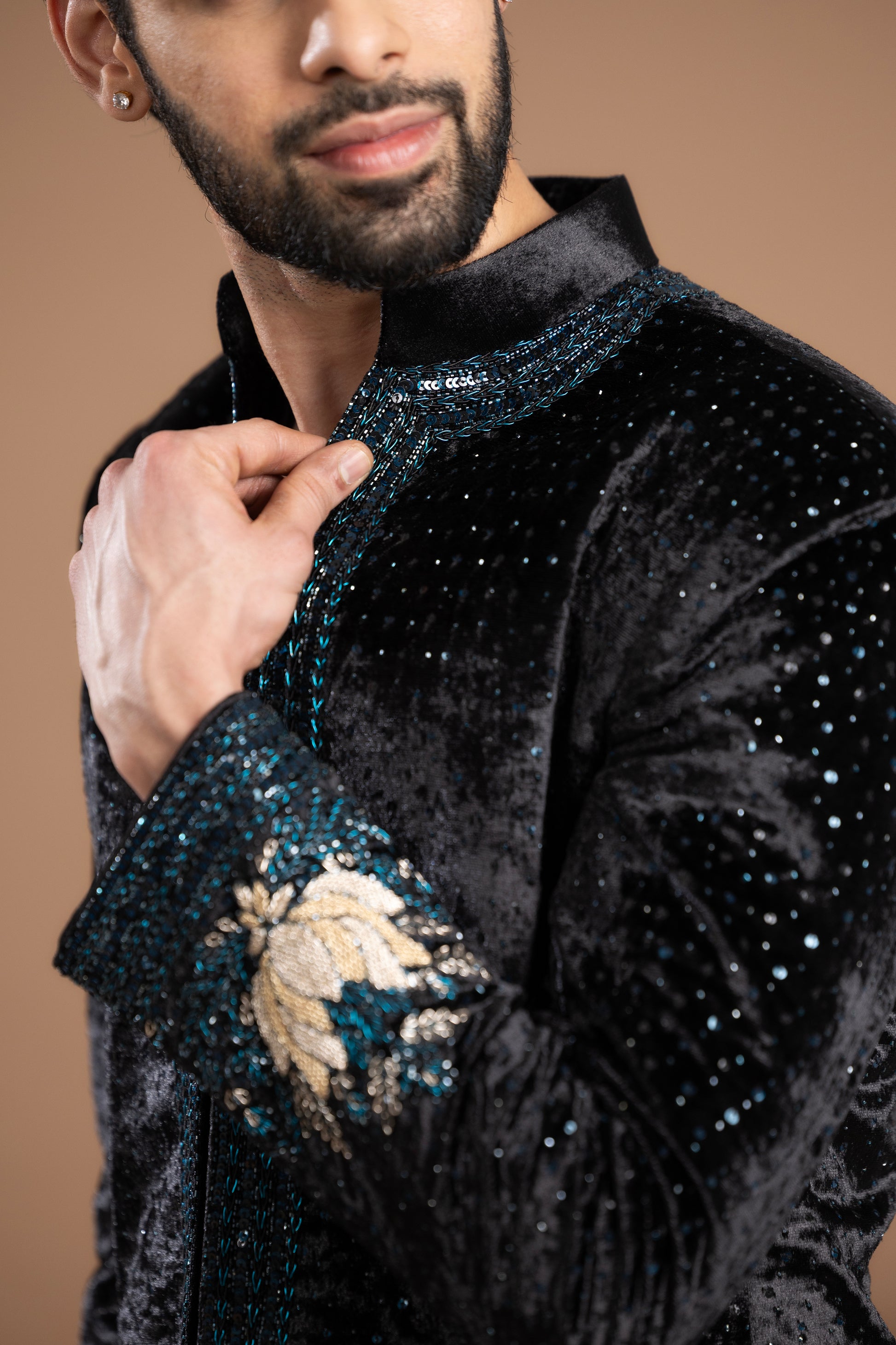 Puffer Jacket-Style With Slightly Flared Velvet Pants. The Jacket Features A Zardozi Lotus Patch On The Back And Sleeves, With Intricate Zardozi, Sequin, And Cutdana Detailing Along The Collar, Button Flaps, Sleeves, And Back, Finished With An All-Over Splatter Of Blue And Black Sequins