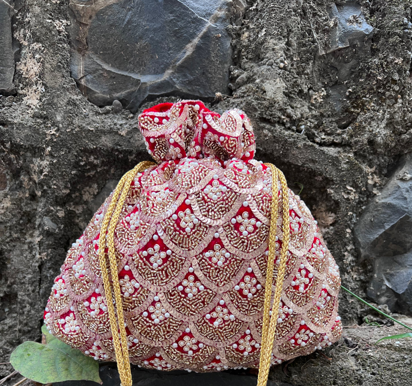Red And Gold Modish Base With Sequins Scallops And Delicate Pearl Work.