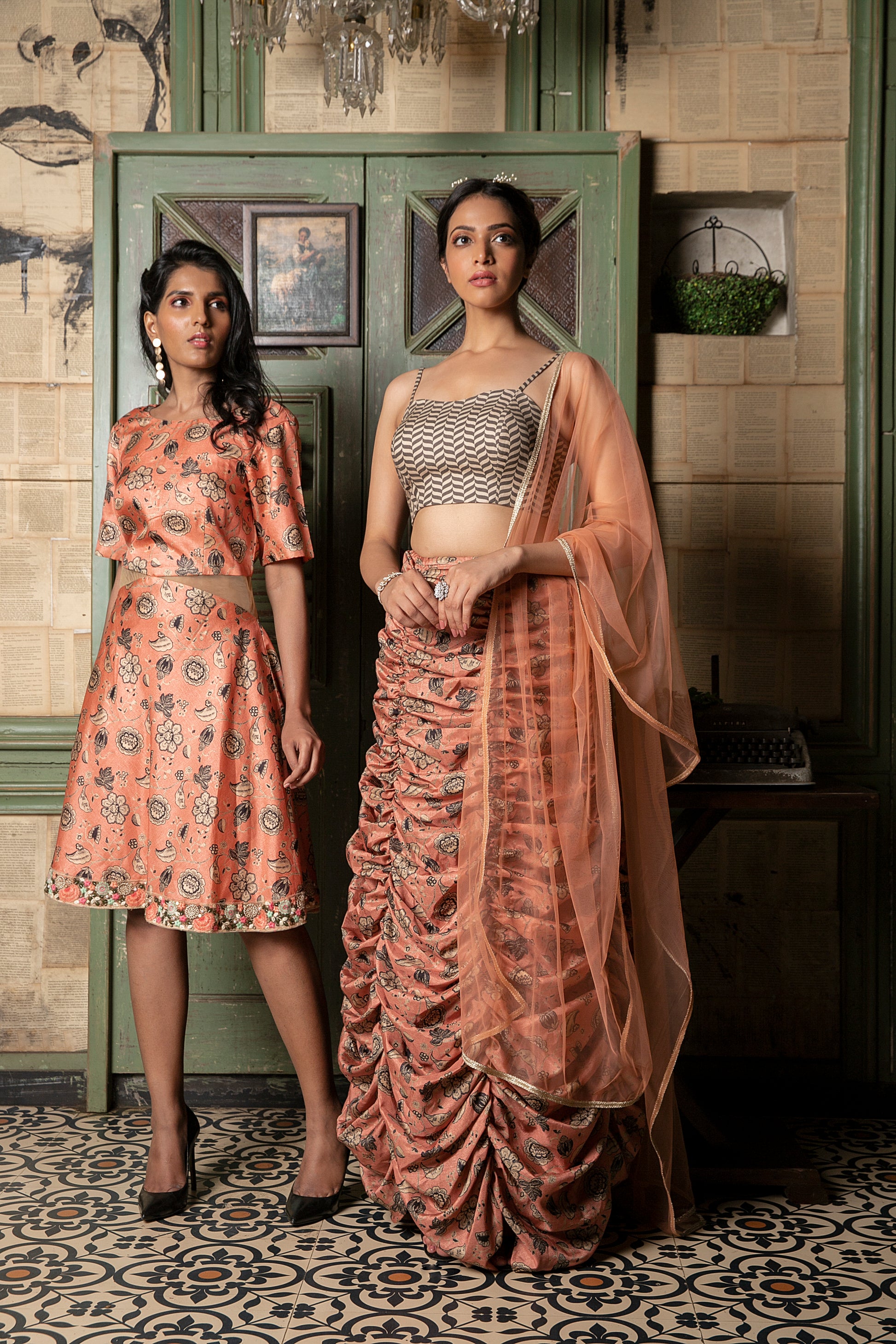 Dusky Coral Floral Printed Khadi Silk A- Line Dress, With Waist Net Detailing, And Floral Embroidered Border.