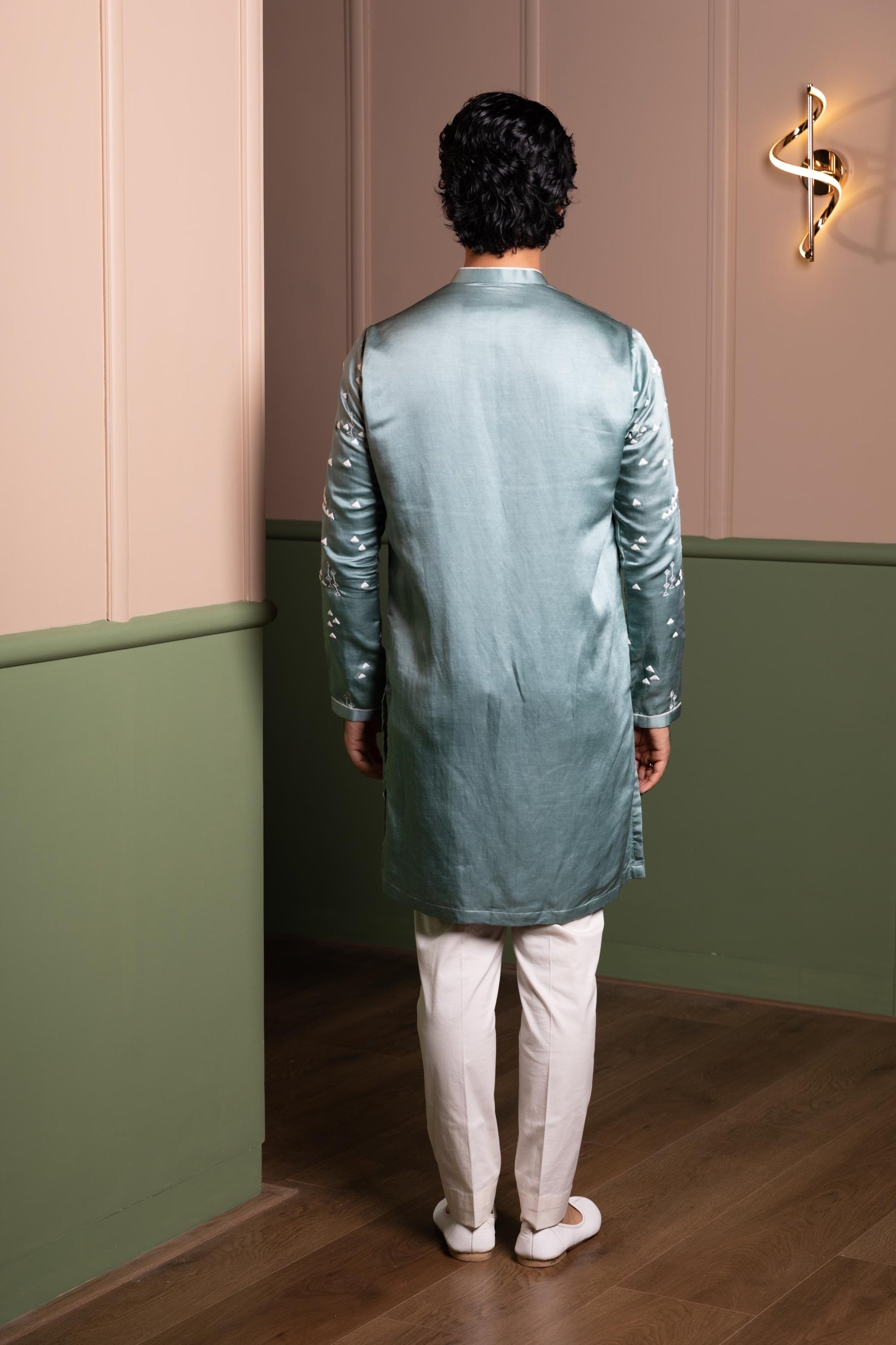 Satin Linen Kurta With Symbol Embroidery In Thread Paired With Straight Pants.