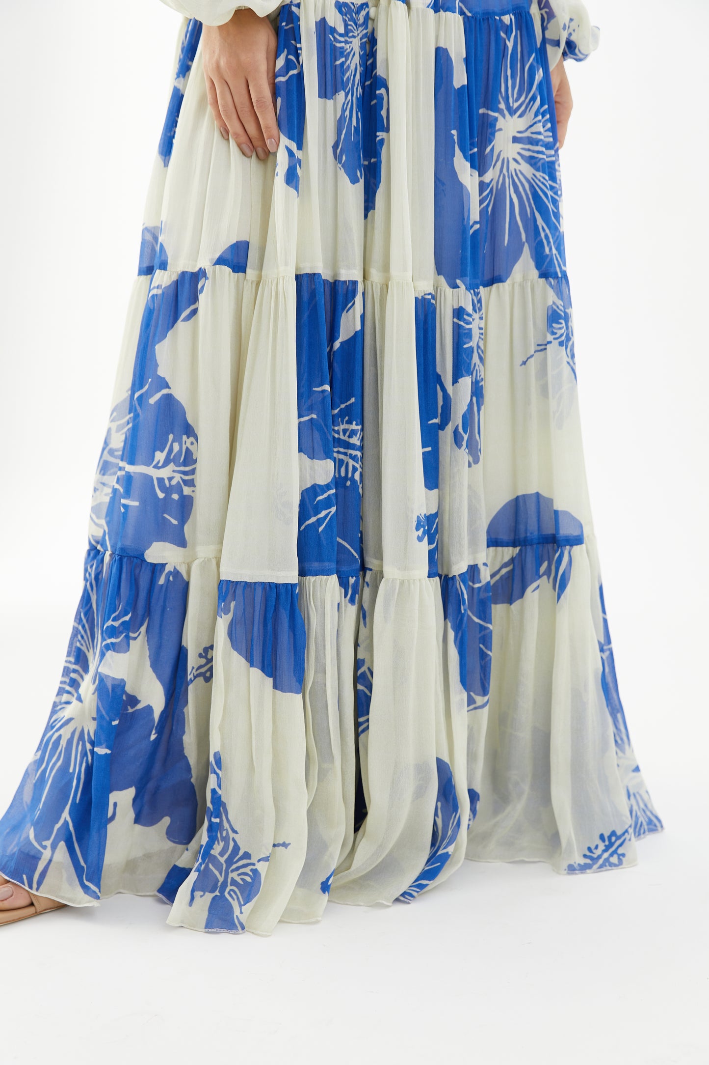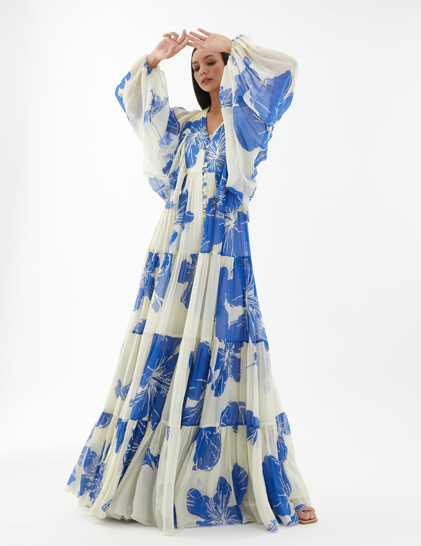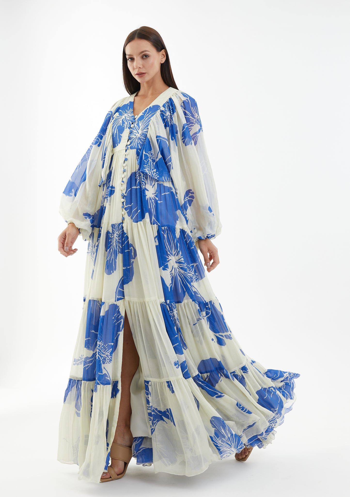 White And Blue Dress Based On Chiffon Features Classic Floral Motifs And Balloon Sleeves.