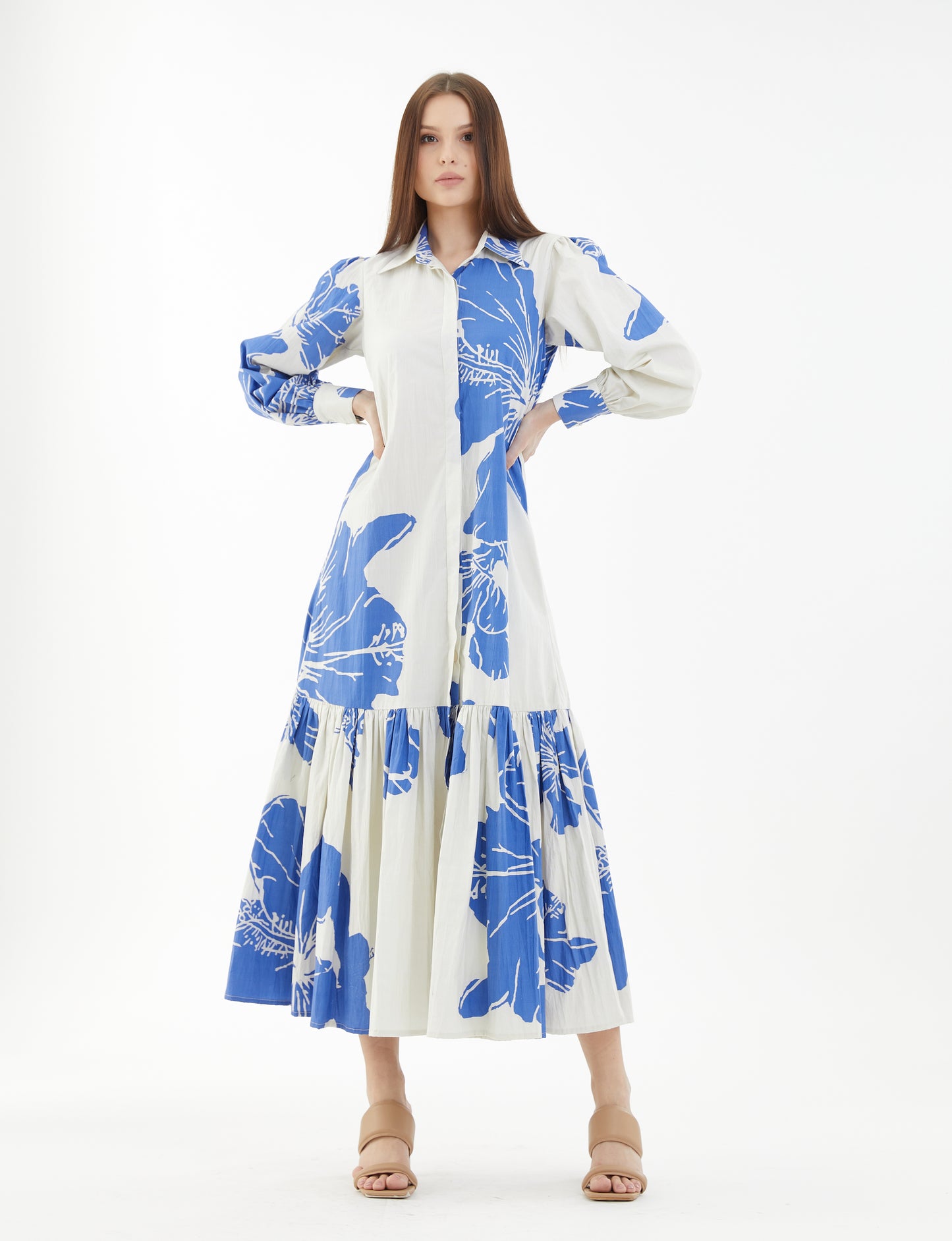 White And Blue Single Tier Dress Based On Poplin Cotton Features Classic Floral Motifs.