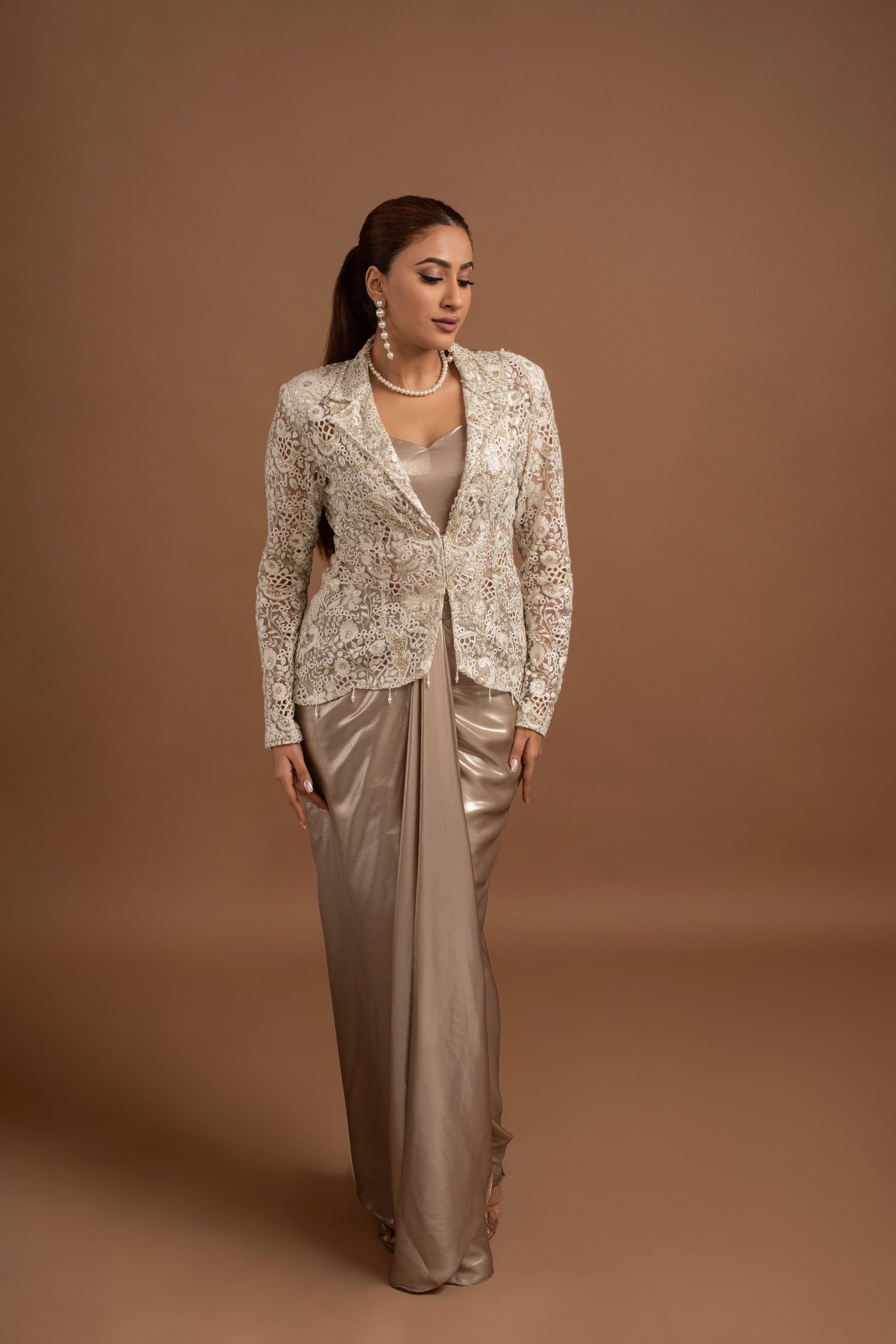 White Embroidered Jacket With Pearl Embellishments Paired With Golden Metallic Inside Blouse And Drape Skirt.