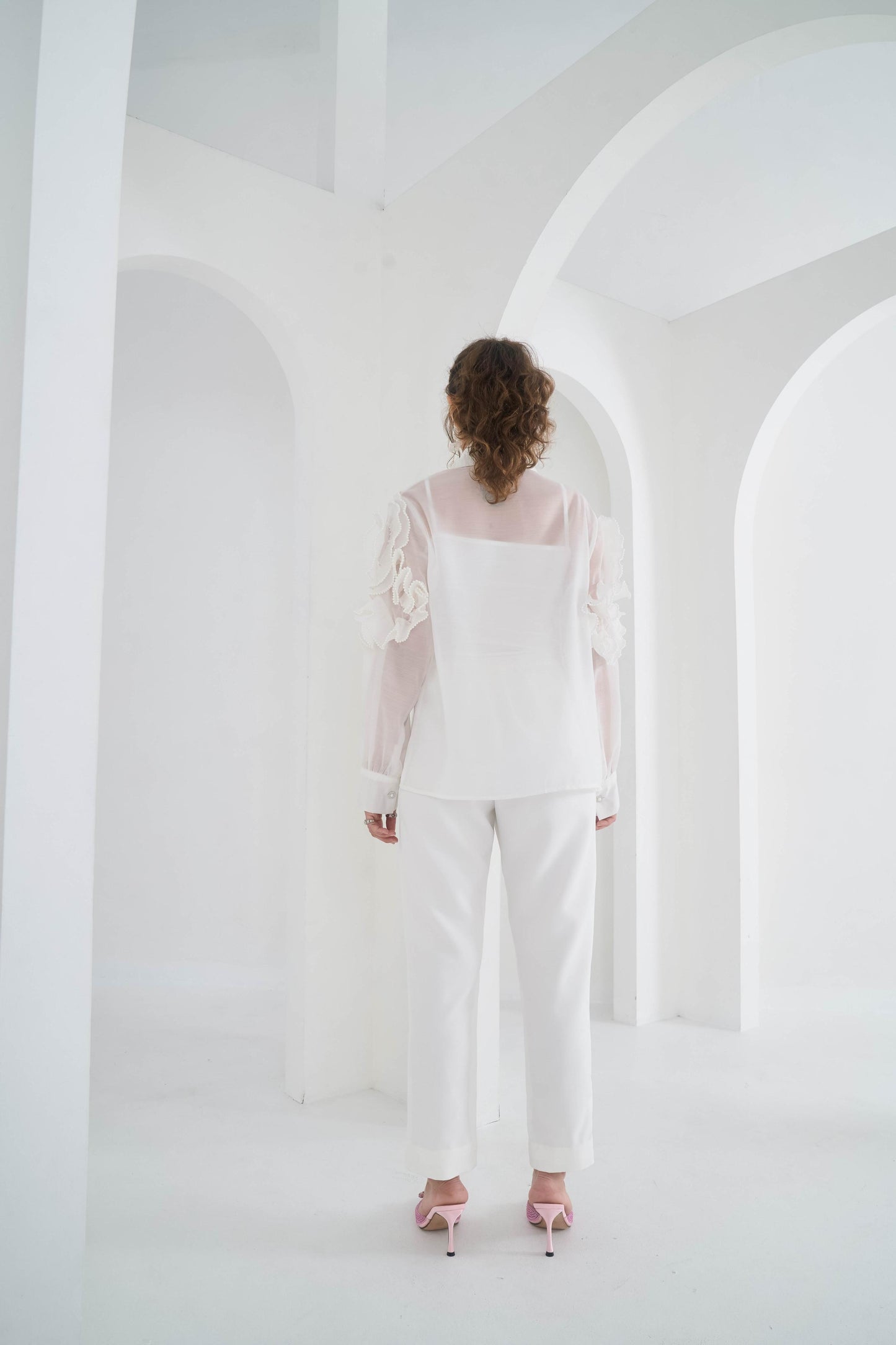Featuring White Shirt In Organdy Base With Pleated Detailing And Pearl Embellishment On Sleeves.