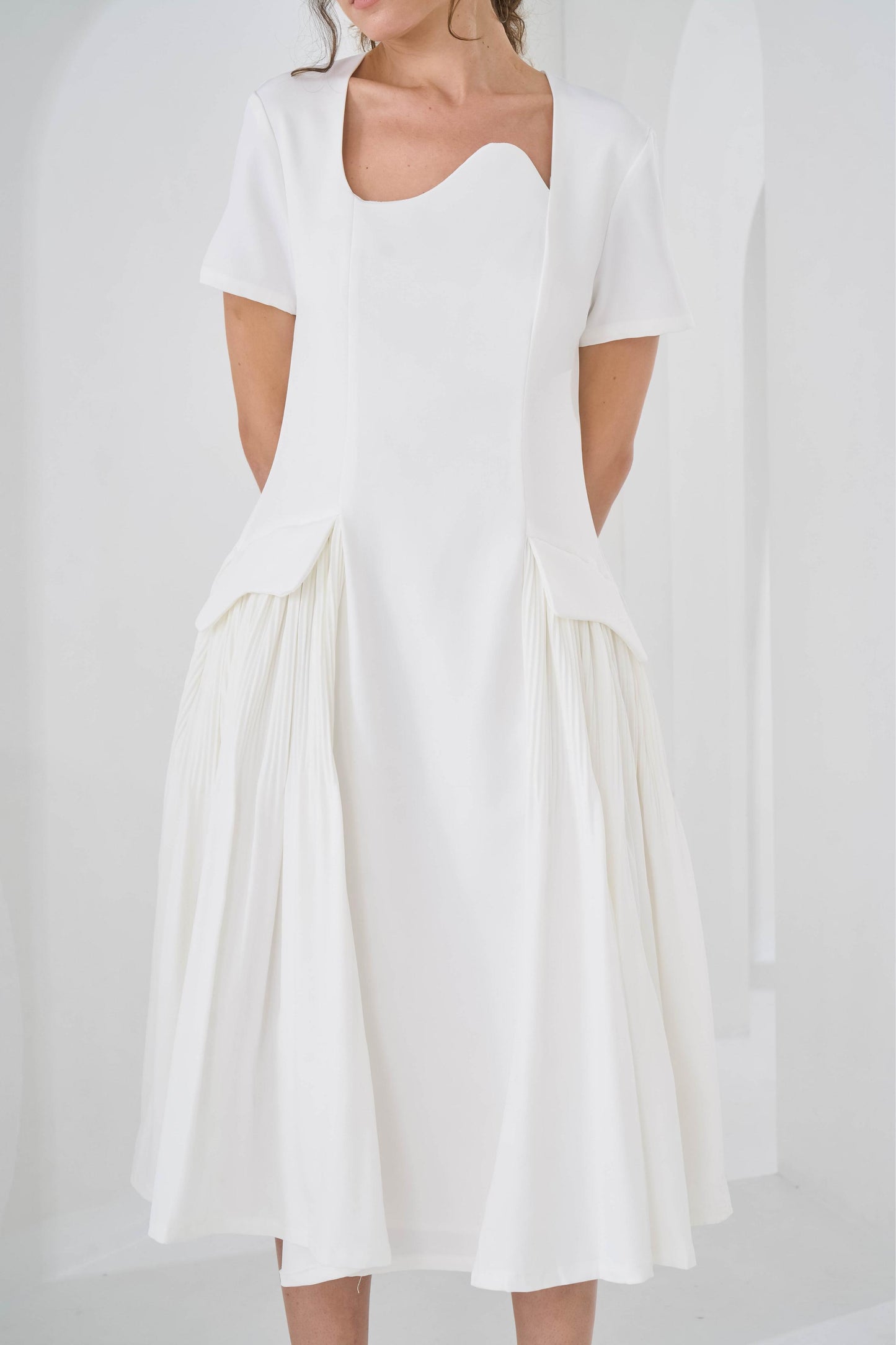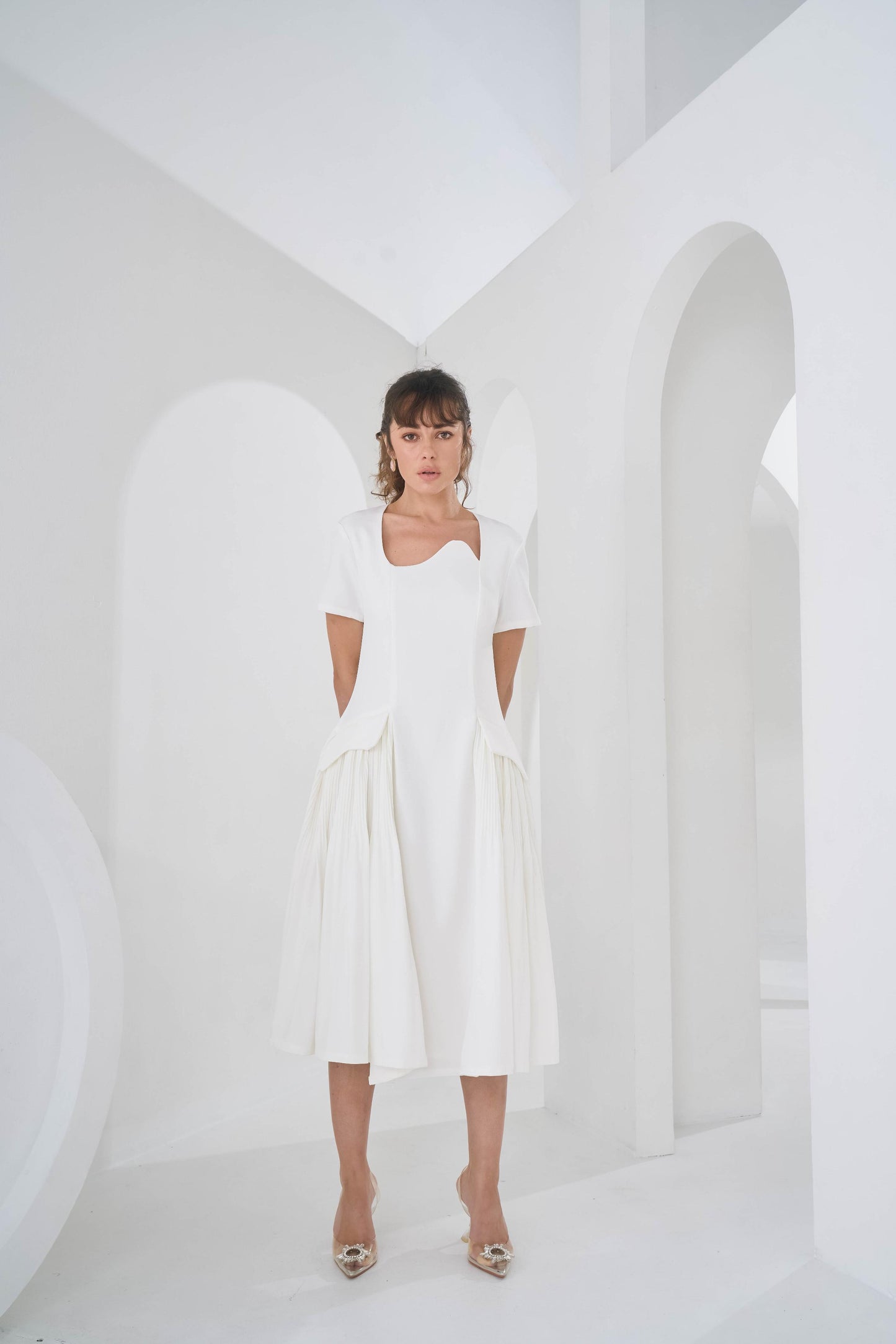 Featuring White Monroe Dress In Crepe Base With Asymmetric Pattern On Neck And Both Side Pleated Detailing At Bottom.
