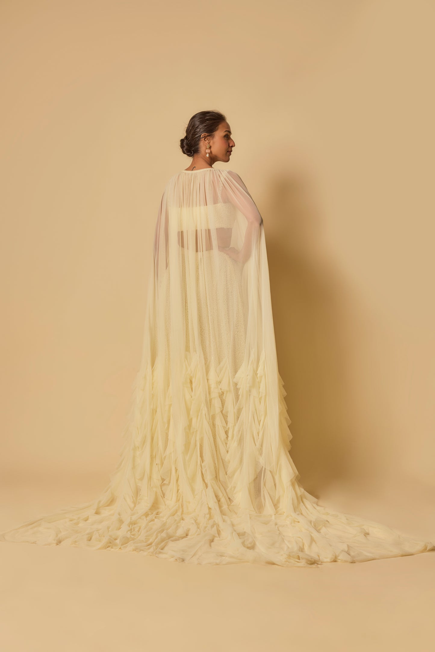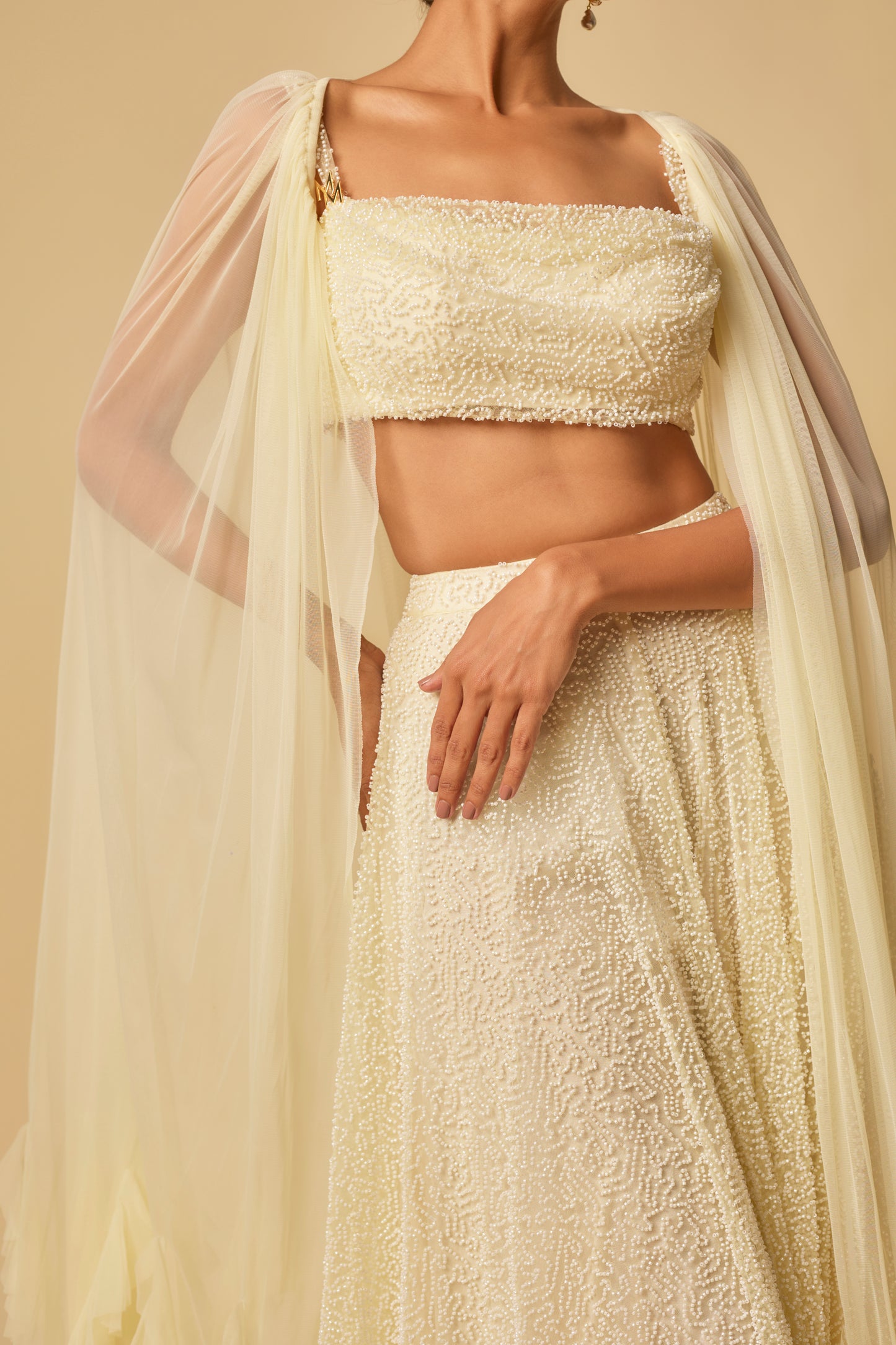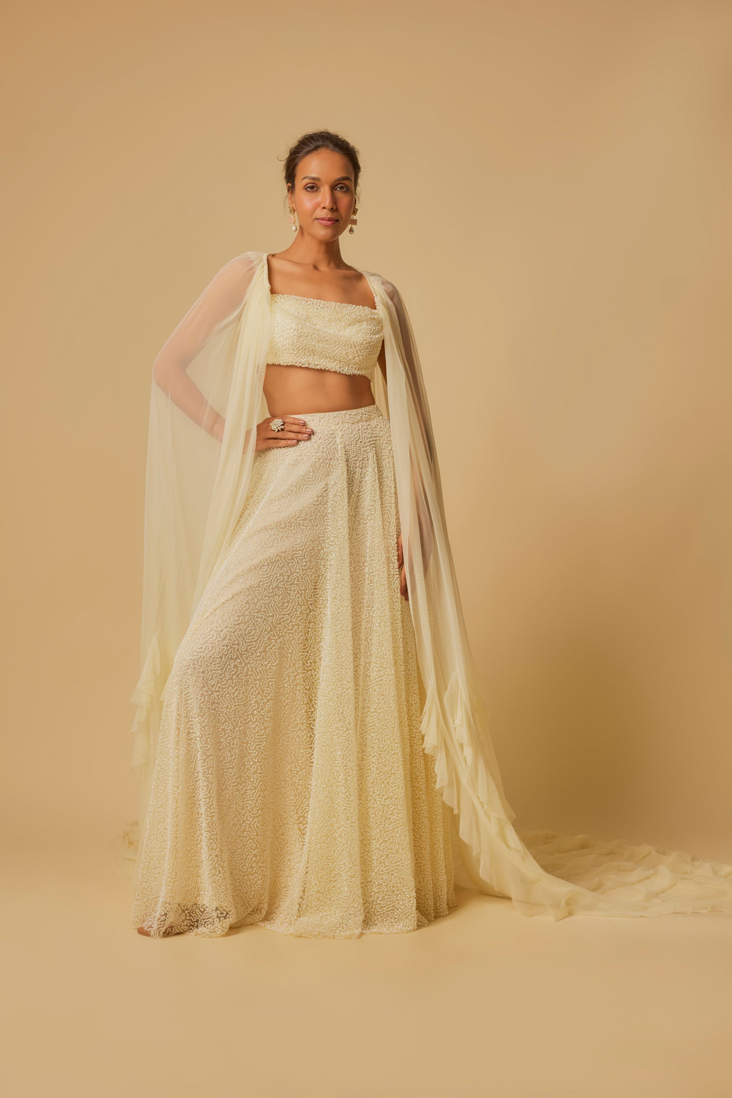 Featuring Yellow Heavy Embroidered Gharara Pant In Tulle With Matching Drape Blouse And Ruffle Cape In Tulle.