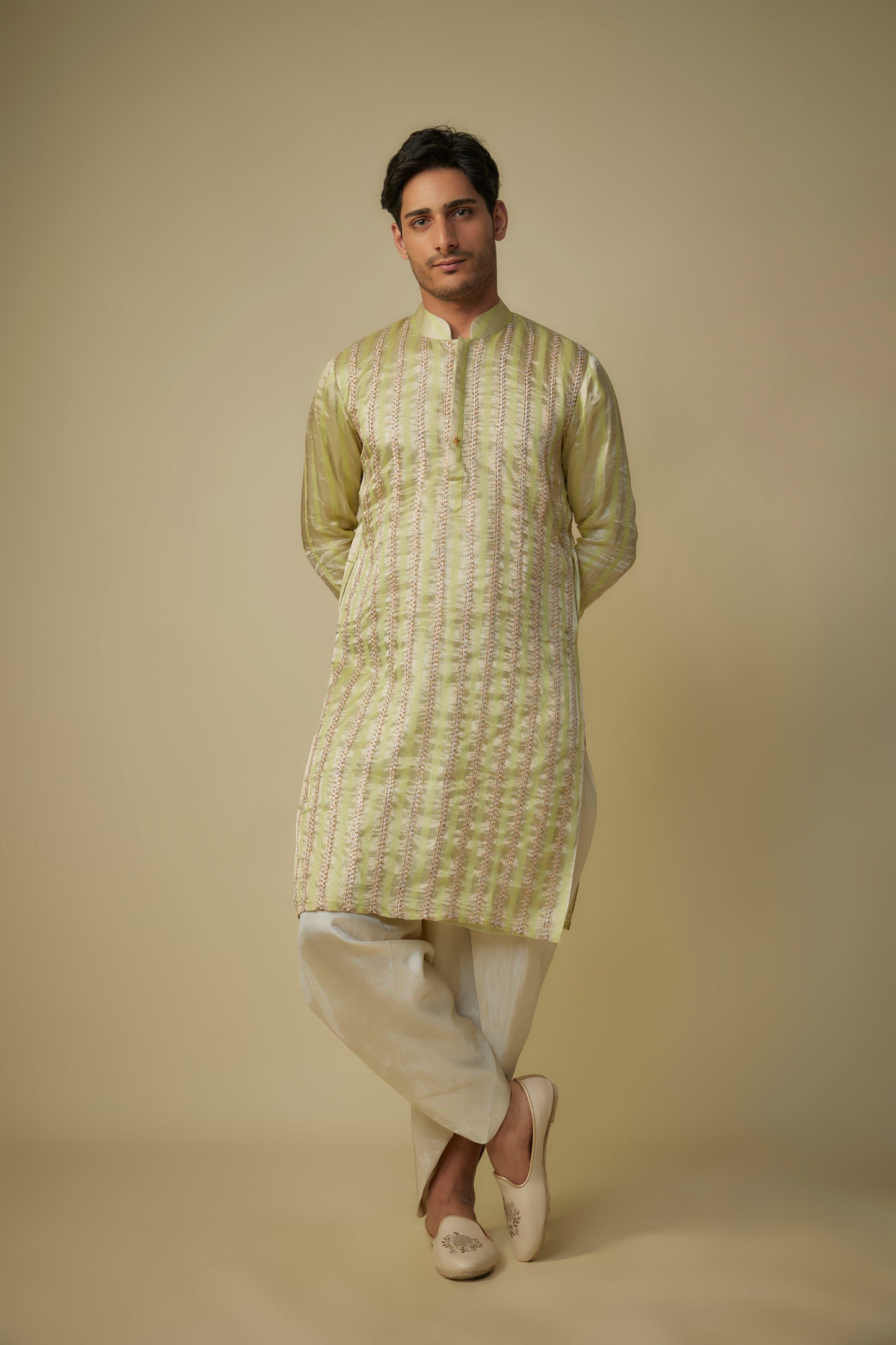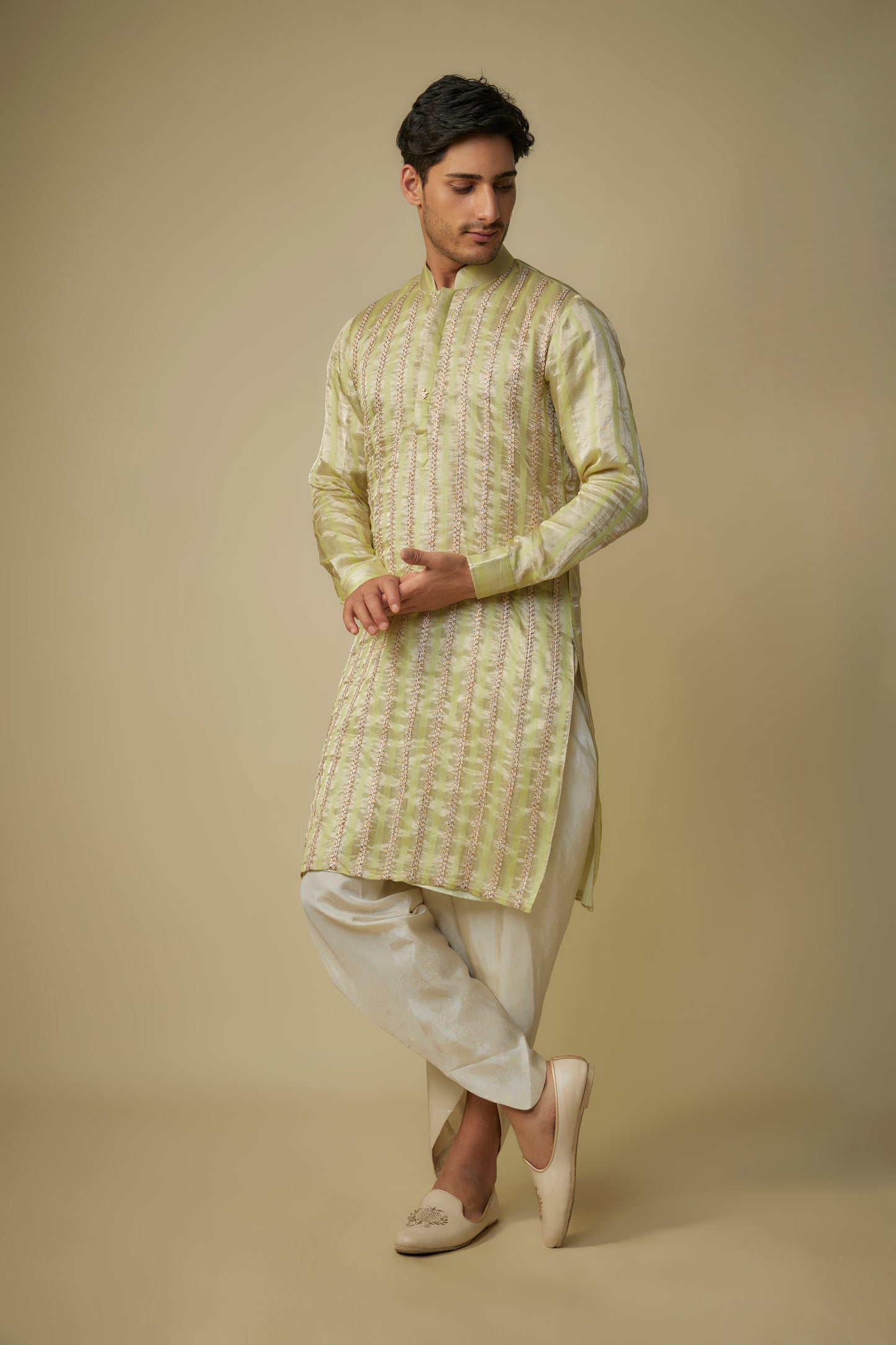 Featuring Yellow Satin Silk Kurta With Yellow Jacquard Dhoti.
