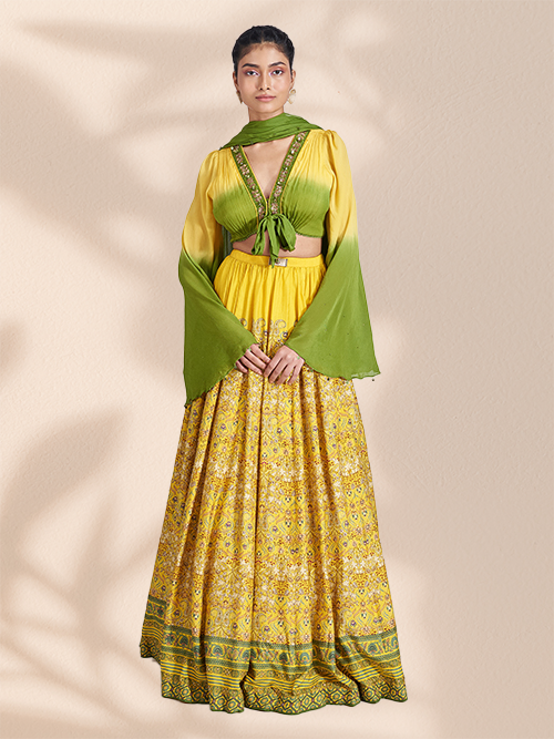 Yellow Printed Lehenga Set With Hand Embroidery V- Neckline, Chiffon Flared Sleeve And Shaded Chiffon Dupatta.