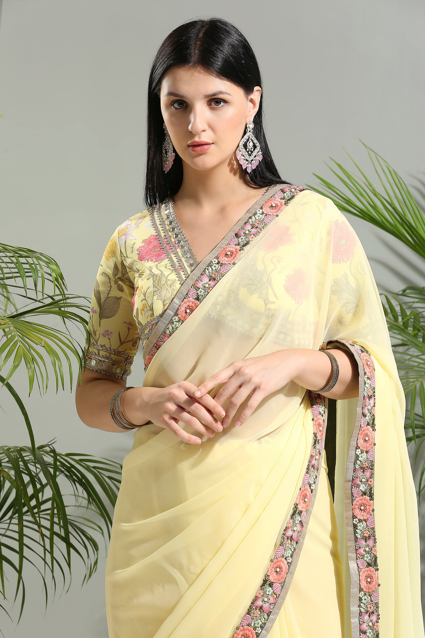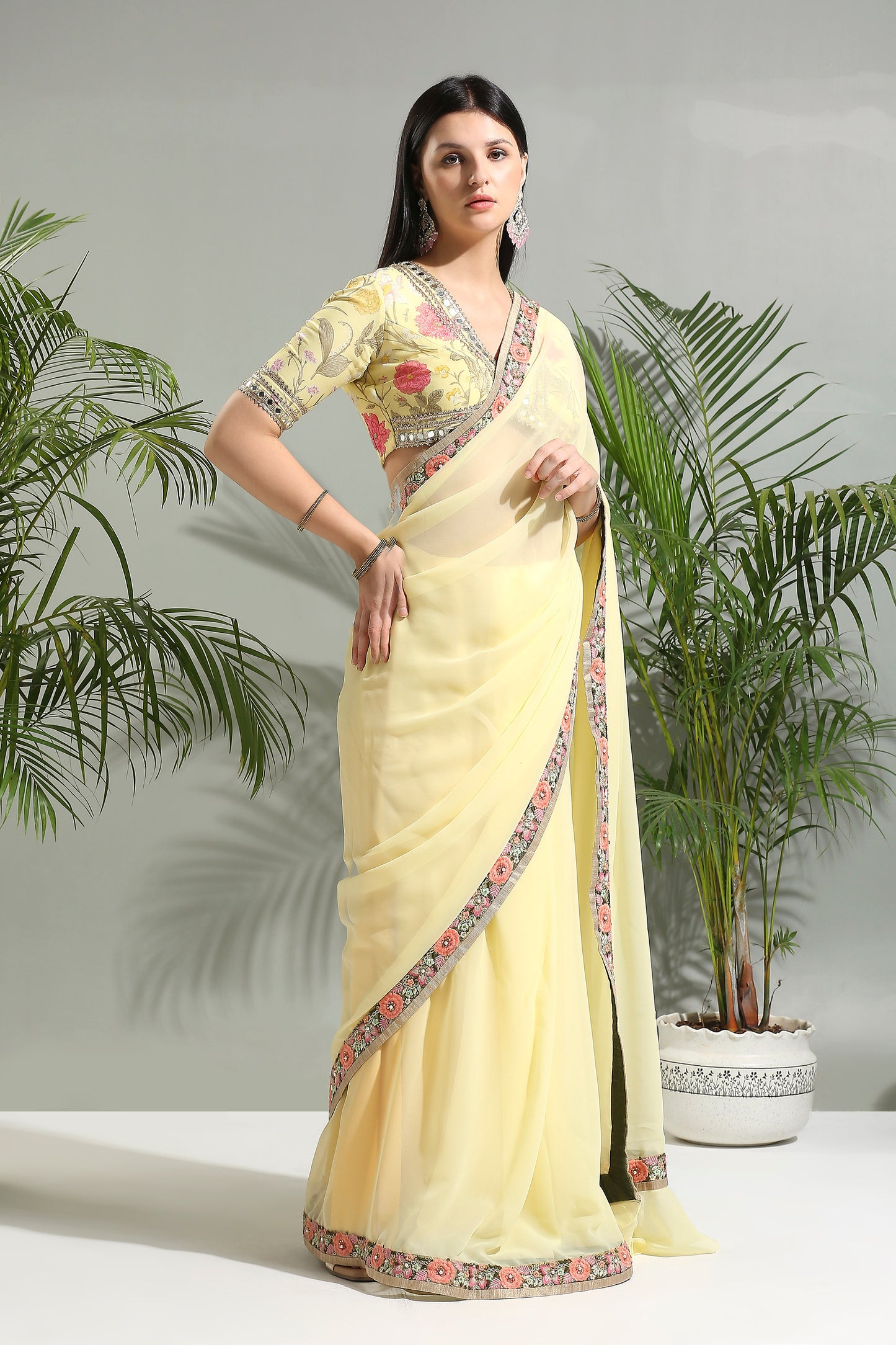 YELLOW SAREE WITH FLORAL BLOUSE