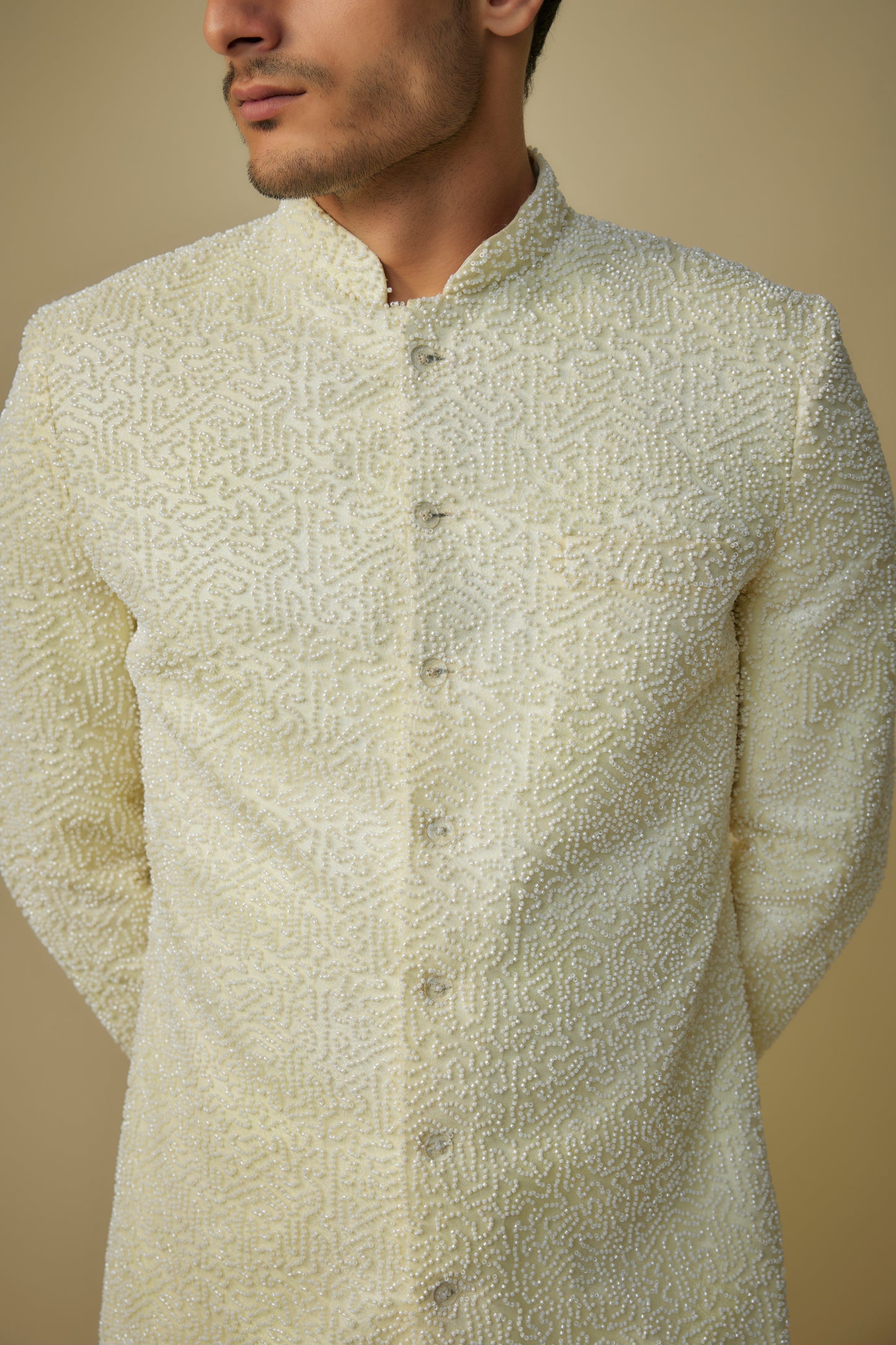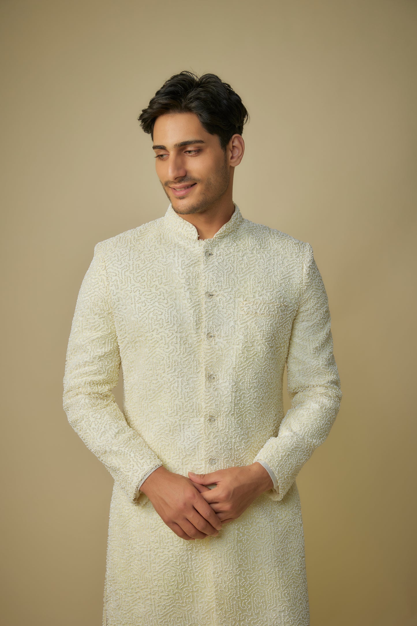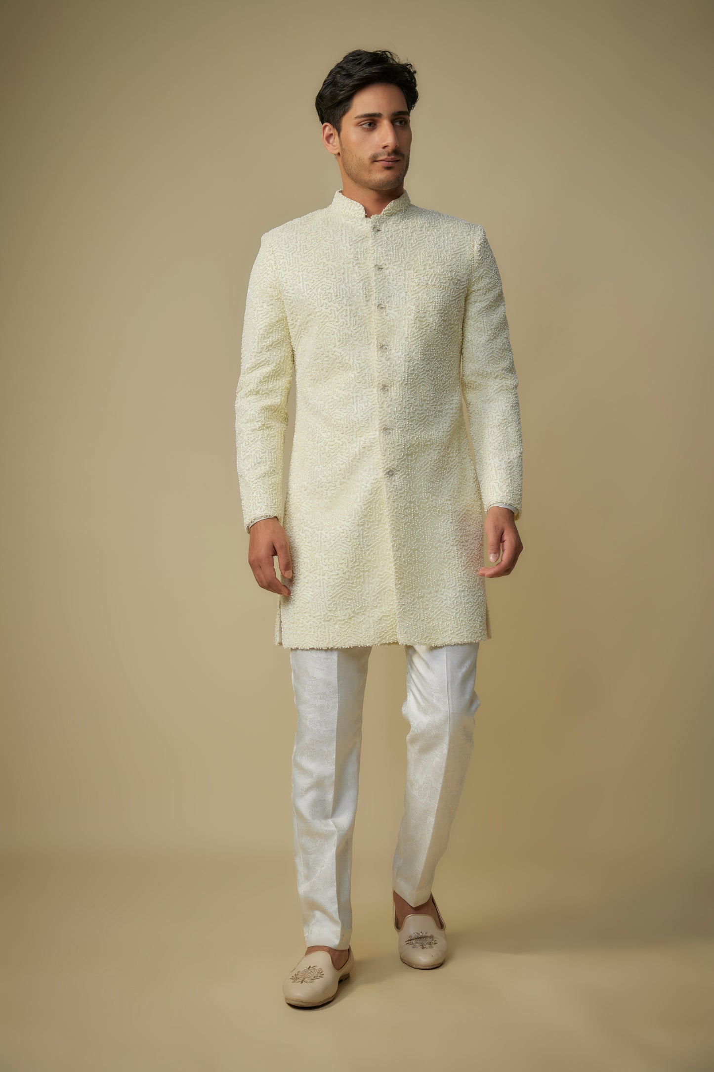 Featuring Yellow Embroidered Sherwani With White Broquade Pant.