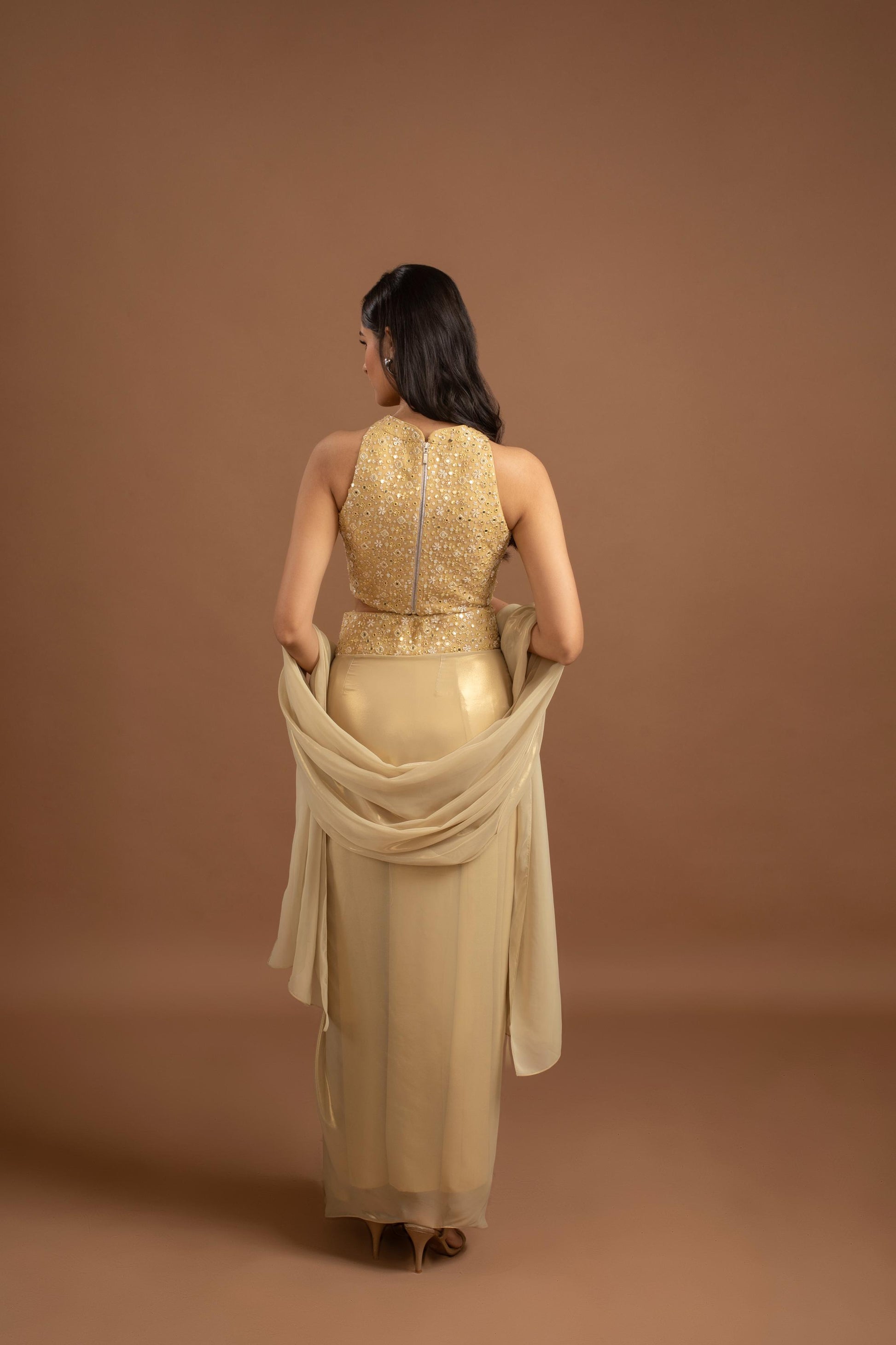 Yellow High Neck Collar Blouse With Yellow Metallic Drape Skirt.