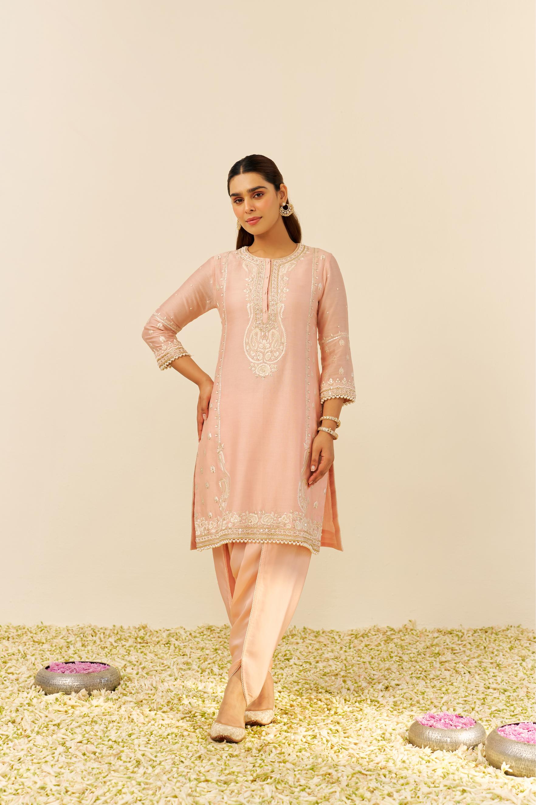 This Exquisite Ensemble Is Crafted From Pure Silk Chanderi Fabric, Offering A Luxurious And Refined Texture. It Is Elegantly Adorned With Heritage Parsi Gara Embroidery, Showcasing Intricate Craftsmanship That Adds Timeless Beauty To The Design. The Outfit Features A Chic Zero-Neck With A Placket And Three-Quarter Sleeves, Combining Traditional Elegance With Contemporary Flair. Paired With A Stylish Tulip Dhoti, The Ensemble Radiates A Unique Sense Of Grace And Sophistication. The Entire Creation Is Beautifully Highlighted With Delicate Tilla, Gota, And Pearls, Which Enhance The Intricate Embroidery And Elevate The Overall Look. Finished With The Finest Chanderi Silk Fabric, This Ensemble Is A Perfect Fusion Of Heritage, Craftsmanship, And Modern Style.