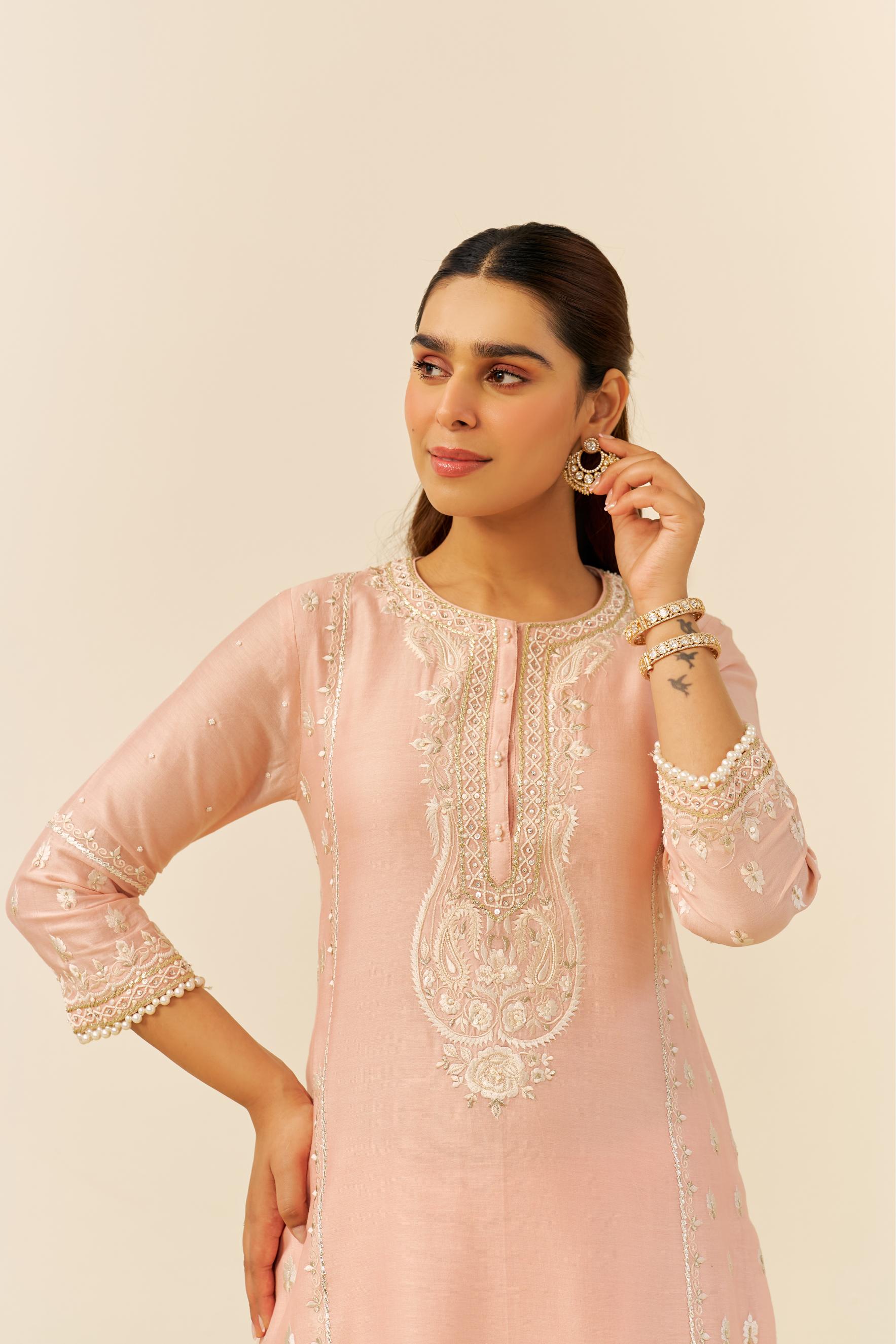 Elevate Your Style With This Exquisite Ensemble, Crafted From Luxurious Pure Silk Chanderi Fabric, Known For Its Refined Texture And Timeless Appeal. Adorned With Intricate Heritage Parsi Gara Embroidery, The Piece Showcases Exceptional Craftsmanship, Adding A Touch Of Cultural Richness To The Design. Featuring A Chic Zero-Neck With A Placket And Elegant Three-Quarter Sleeves, This Outfit Seamlessly Blends Traditional Elegance With Contemporary Flair.
