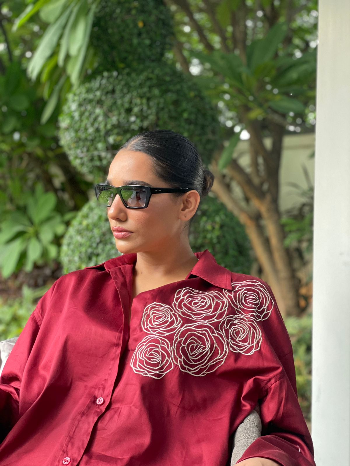 Classic Drop Shoulder Zar Shirt Based On Cotton Satin Features Intricate Resham And Zari Embroidery On The Left Shoulder.