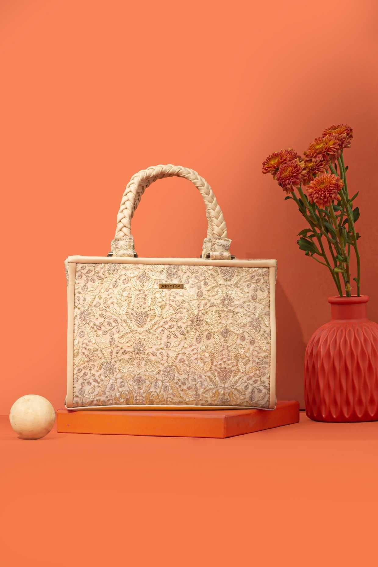 Material: Semi Silk Threadwork Fabric, Suede Lining, Metal Hardware, Faux Leather