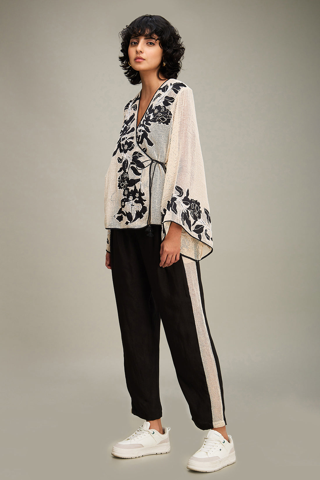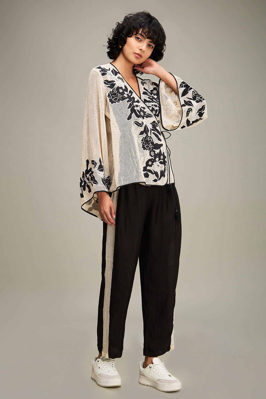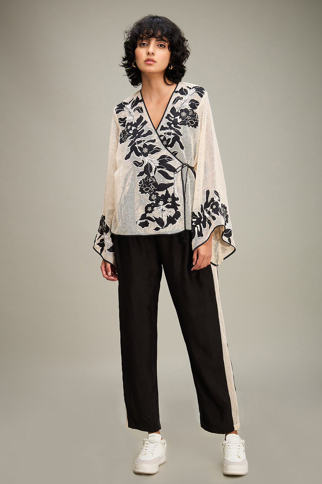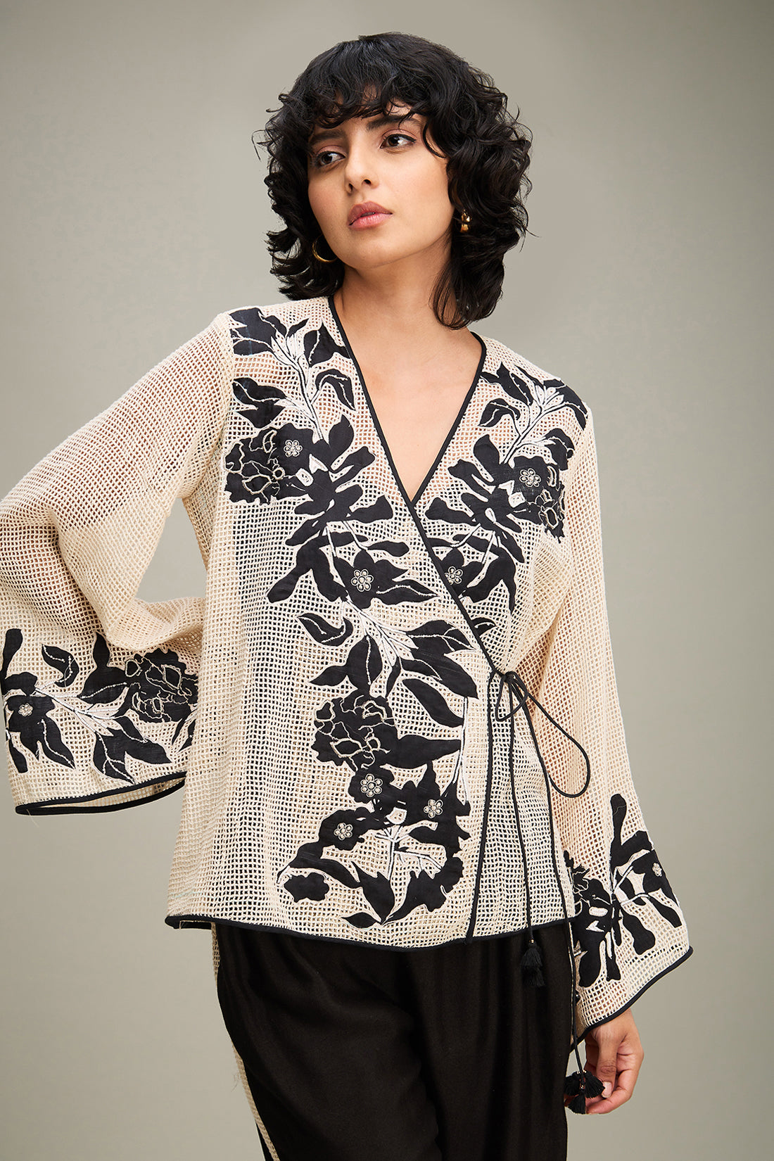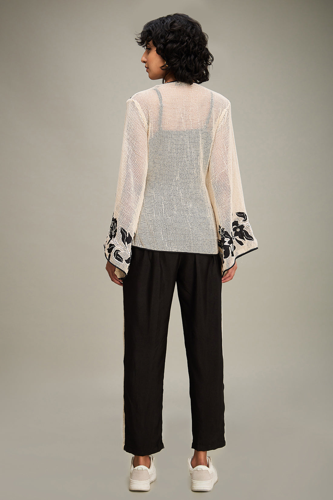 Off White Applique Short Angarkha Top in Handloom Cotton Comes With A Slip And Black Flared Pants in Linen Slub Cotton.